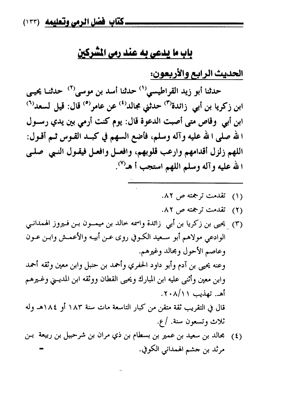 46 - حَدَّثَنَا أَبُو يَزِيدَ الْقَرَاطِيسِيُّ، حَدَّثَنَا أَسَدُ بْنُ مُوسَى، حَدَّثَنَا يَحْيَى بْنُ زَكَرِيَّا بْنِ أَبِي زَائِدَةَ، حَدَّثَنِي مُجَالِدٌ، عَنْ عَامِرٍ، قَالَ: قِيلَ لِسَعْدِ بْنِ أَبِي وَقَّاصٍ: مَتَى أَصَبْتَ الدَّعْوَةَ؟ قَالَ: يَوْمَ كُنْتُ أَرْمِي بَيْنَ يَدَيْ رَسُولِ اللَّهِ صَلَّى اللَّهُ عَلَيْهِ وَسَلَّمَ، فَأَضَعُ السَّهْمَ فِي كَبِدِ الْقَوْسِ، ثُمَّ أَقُولُ: اللَّهُمَّ زَلْزِلْ أَقْدَامَهُمْ , وَأَرْعِبْ قُلُوبَهُمْ , وَافْعَلْ , وَافْعَلْ، فَيَقُولُ النَّبِيُّ صَلَّى اللَّهُ عَلَيْهِ وَسَلَّمَ «§اللَّهُمَّ اسْتَجِبْ لِسَعْدٍ»