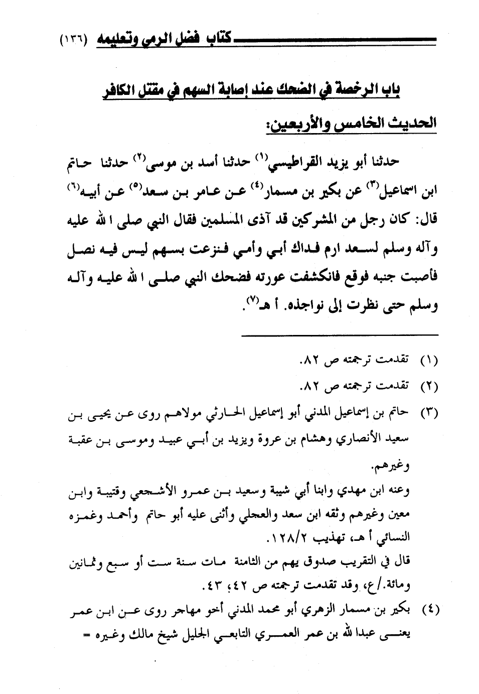47 - حَدَّثَنَا أَبُو يَزِيدَ الْقَرَاطِيسِيُّ، حَدَّثَنَا أَسَدُ بْنُ مُوسَى، حَدَّثَنَا حَاتِمُ بْنُ إِسْمَاعِيلَ، عَنْ بُكَيْرِ بْنِ مِسْمَارٍ، عَنْ عَامِرِ بْنِ سَعْدٍ، عَنْ أَبِيهِ، قَالَ: كَانَ رَجُلٌ مِنَ الْمُشْرِكِينَ قَدْ آذَى الْمُسْلِمِينَ، فَقَالَ النَّبِيُّ صَلَّى اللَّهُ عَلَيْهِ وَسَلَّمَ لِسَعْدٍ: «§ارْمِ فِدَاكَ أَبِي وَأُمِّي» فَرُعْتُ بِسَهْمٍ لَيْسَ فِيهِ نَصْلٌ، فَأَصَبْتُ جَنْبَهُ، فَوَقَعَ، وَانْكَشَفَتْ عَوْرَتُهُ، فَضَحِكَ النَّبِيُّ صَلَّى اللَّهُ عَلَيْهِ وَسَلَّمَ حَتَّى نَظَرْتُ إِلَى نَوَاجِذِهِ