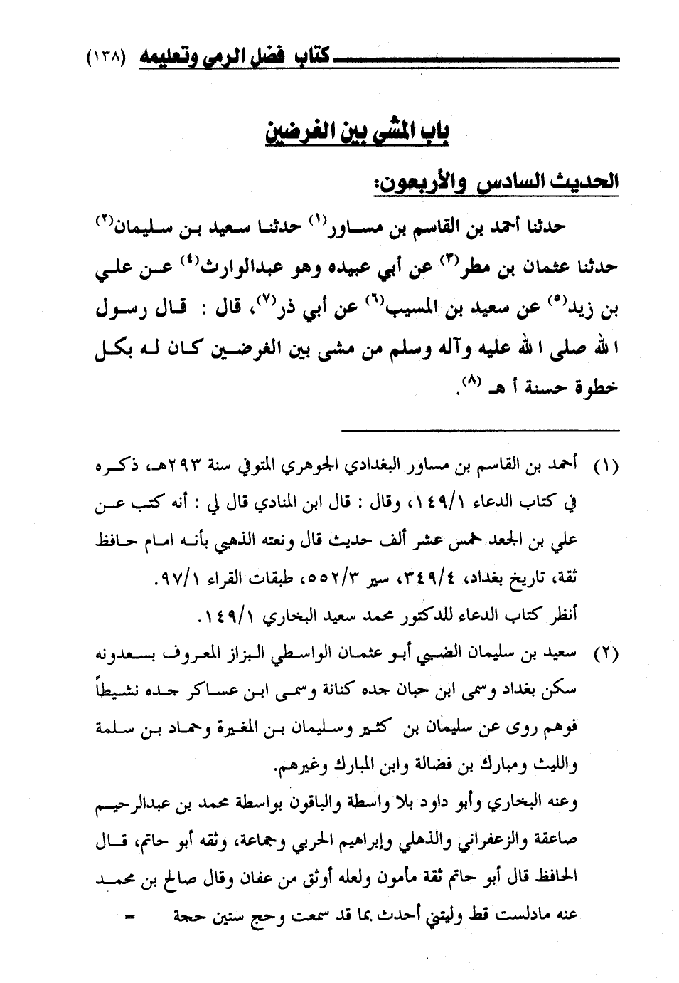 48 - حَدَّثَنَا أَحْمَدُ بْنُ الْقَاسِمِ بْنِ مُسَاوِرٍ، حَدَّثَنَا سَعِيدُ بْنُ سُلَيْمَانَ، , حَدَّثَنَا عُثْمَانُ بْنُ مَطَرٍ، عَنْ أَبِي عُبَيْدَةَ وَهُوَ عَبْدُ الْوَارِثِ عَنْ عَلِيِّ بْنِ زَيْدٍ، عَنْ سَعِيدِ بْنِ الْمُسَيِّبِ، عَنْ أَبِي الدَّرْدَاءِ، قَالَ: قَالَ رَسُولُ اللَّهِ صَلَّى اللَّهُ عَلَيْهِ وَسَلَّمَ: «§مَنْ مَشَى بَيْنَ الْغَرَضَيْنِ، كَانَ لَهُ بِكُلِّ خُطْوَةٍ حَسَنَةٌ»
