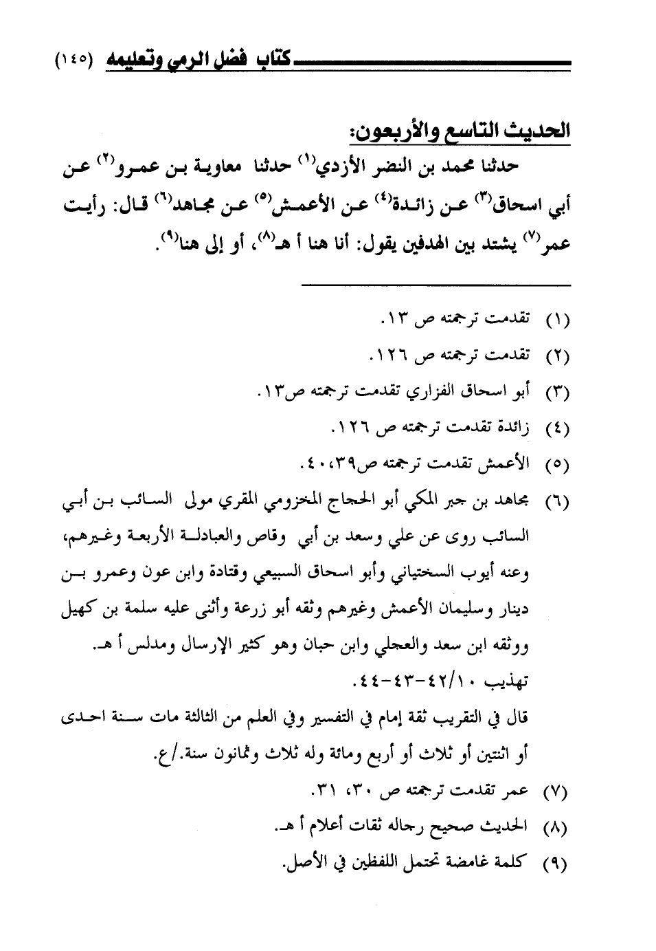 51 - حَدَّثَنَا مُحَمَّدُ بْنُ النَّضْرِ، حَدَّثَنَا مُعَاوِيَةُ بْنُ عَمْرٍو، عَنْ أَبِي إِسْحَاقَ، عَنْ زَائِدَةَ، عَنِ الْأَعْمَشِ، عَنْ مُجَاهِدٍ، قَالَ: " §رَأَيْتُ ابْنَ عُمَرَ يَشْتَدُّ بَيْنَ الْهَدَفَيْنِ , وَيَقُولُ: أَنَا لَهَا "