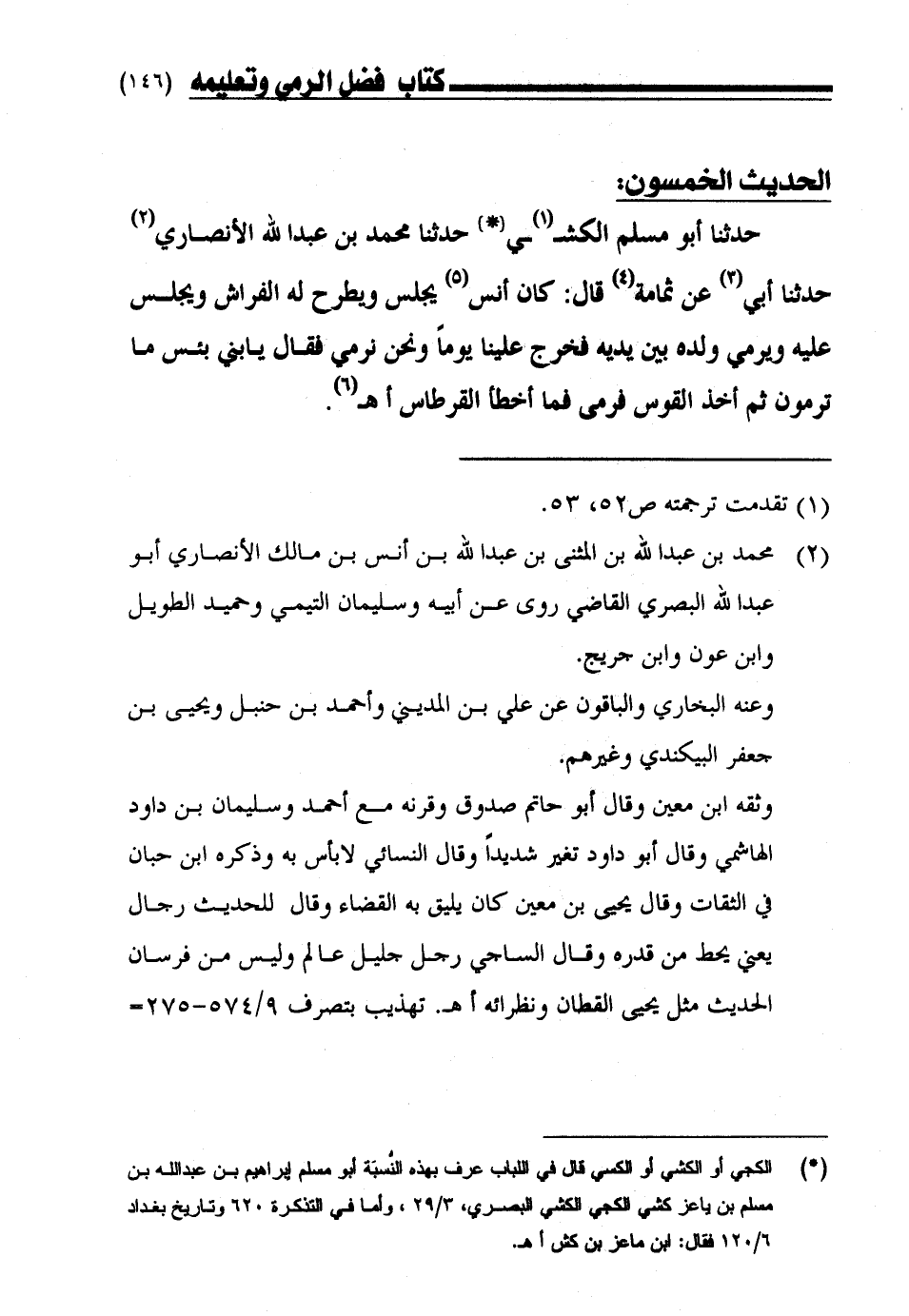52 - حَدَّثَنَا أَبُو مُسْلِمٍ الْكَشِّيُّ، حَدَّثَنَا مُحَمَّدُ بْنُ عَبْدِ اللَّهِ الْأَنْصَارِيُّ، حَدَّثَنَا أَبِي، عَنْ ثُمَامَةَ، قَالَ: " كَانَ أَنَسٌ يَجْلِسُ وَيُطْرَحُ لَهُ الْفِرَاشُ وَيَجْلِسُ عَلَيْهِ وَيَرْمِي وَلَدُهُ بَيْنَ يَدَيْهِ، فَخَرَجَ عَلَيْنَا يَوْمًا وَنَحْنُ نَرْمِي، فَقَالَ: يَا بَنِيَّ §بِئْسَ مَا تَرْمُونَ، ثُمَّ أَخَذَ الْقَوْسَ، فَرَمَى، فَمَا أَخْطَأَ الْقِرْطَاسَ "