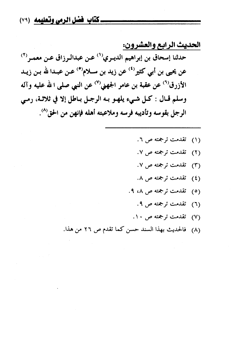 27 - حَدَّثَنَا إِسْحَاقُ بْنُ إِبْرَاهِيمَ الدَّبَرِيُّ، عَنْ عَبْدِ الرَّزَّاقِ، عَنْ مَعْمَرٍ، عَنْ يَحْيَى بْنِ أَبِي كَثِيرٍ، عَنْ زَيْدِ بْنِ سَلَّامٍ، عَنْ عَبْدِ اللَّهِ بْنِ زَيْدٍ الْأَزْرَقِ، عَنْ عُقْبَةَ بْنِ عَامِرٍ الْجُهَنِيِّ، عَنِ النَّبِيِّ صَلَّى اللَّهُ عَلَيْهِ وَسَلَّمَ قَالَ: " §كُلُّ شَيْءٍ يَلْهُو بِهِ الرَّجُلُ بَاطِلٌ إِلَّا فِي ثَلَاثَةٍ: رَمْيِ الرَّجُلِ بِقَوْسِهِ، وَتَأْدِيبِهِ فَرَسَهُ، وَمُلَاعَبَتِهِ أَهْلَهُ، فَإِنَّهُنَّ مِنَ الْحَقِّ "