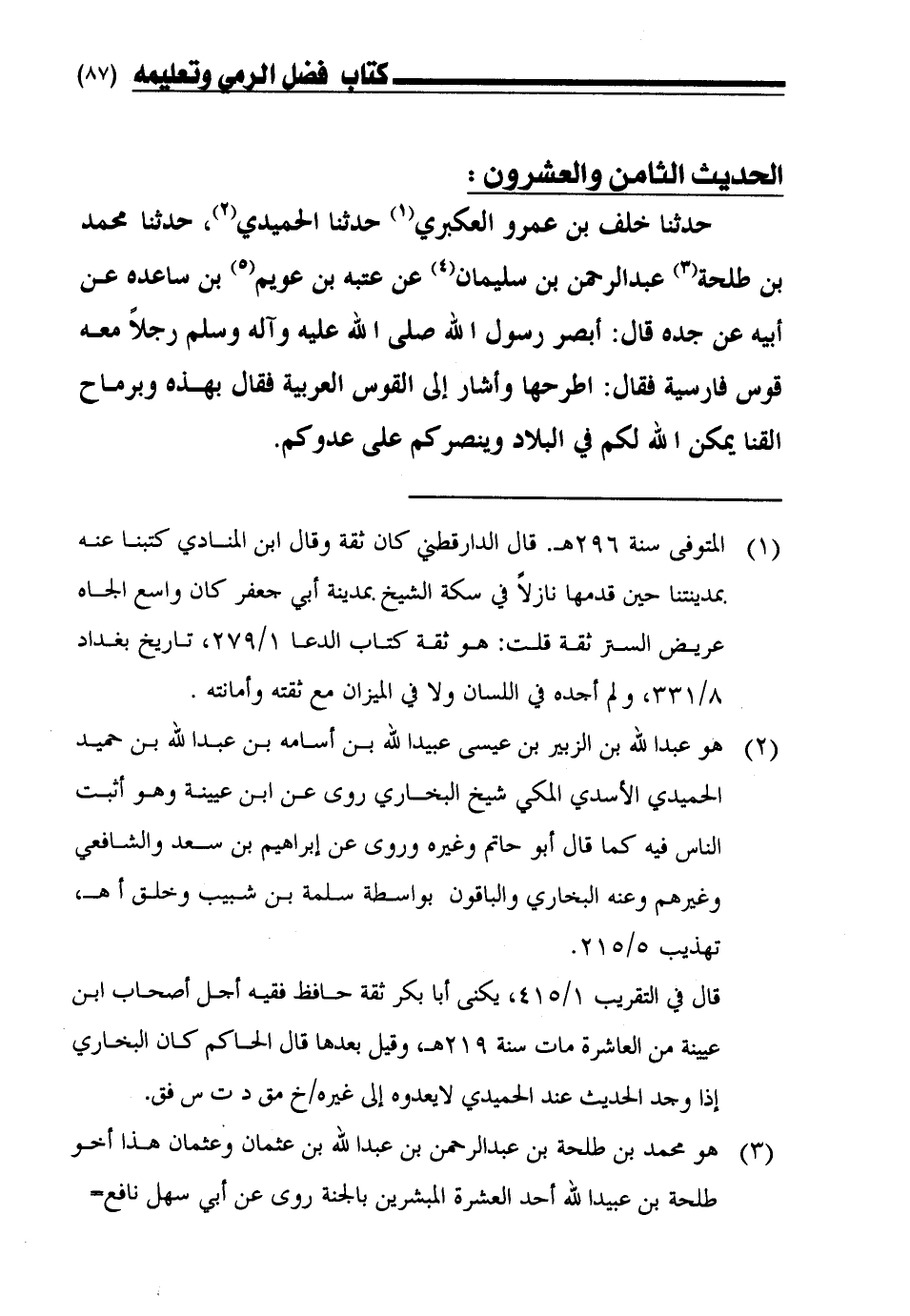 31 - حَدَّثَنَا خَلَفُ بْنُ عَمْرٍو الْعَكْبَرِيُّ، حَدَّثَنَا الْحُمَيْدِيُّ، حَدَّثَنَا مُحَمَّدُ بْنُ طَلْحَةَ، حَدَّثَنِي عَبْدُ الرَّحْمَنِ بْنُ سَالِمِ بْنِ عَبْدِ الرَّحْمَنِ بْنِ عُوَيْمِ بْنِ سَاعِدَةَ، عَنْ أَبِيهِ، عَنْ جَدِّهِ،؛ قَالَ: أَبْصَرَ رَسُولُ اللَّهِ صَلَّى اللَّهُ عَلَيْهِ وَسَلَّمَ رَجُلًا مَعَهُ قَوْسٌ فَارِسِيَّةٌ، فَقَالَ «اطْرَحْهَا» ، وَأَشَارَ إِلَى الْقَوْسِ الْعَرَبِيَّةِ، فَقَالَ: «§بِهَذِهِ وَبِرِمَاحِ الْقَنَا يُمَكِّنُ اللَّهُ لَكُمْ فِي الْبِلَادِ وَينْصُرُكُمْ عَلَى عَدُوِّكُمْ»