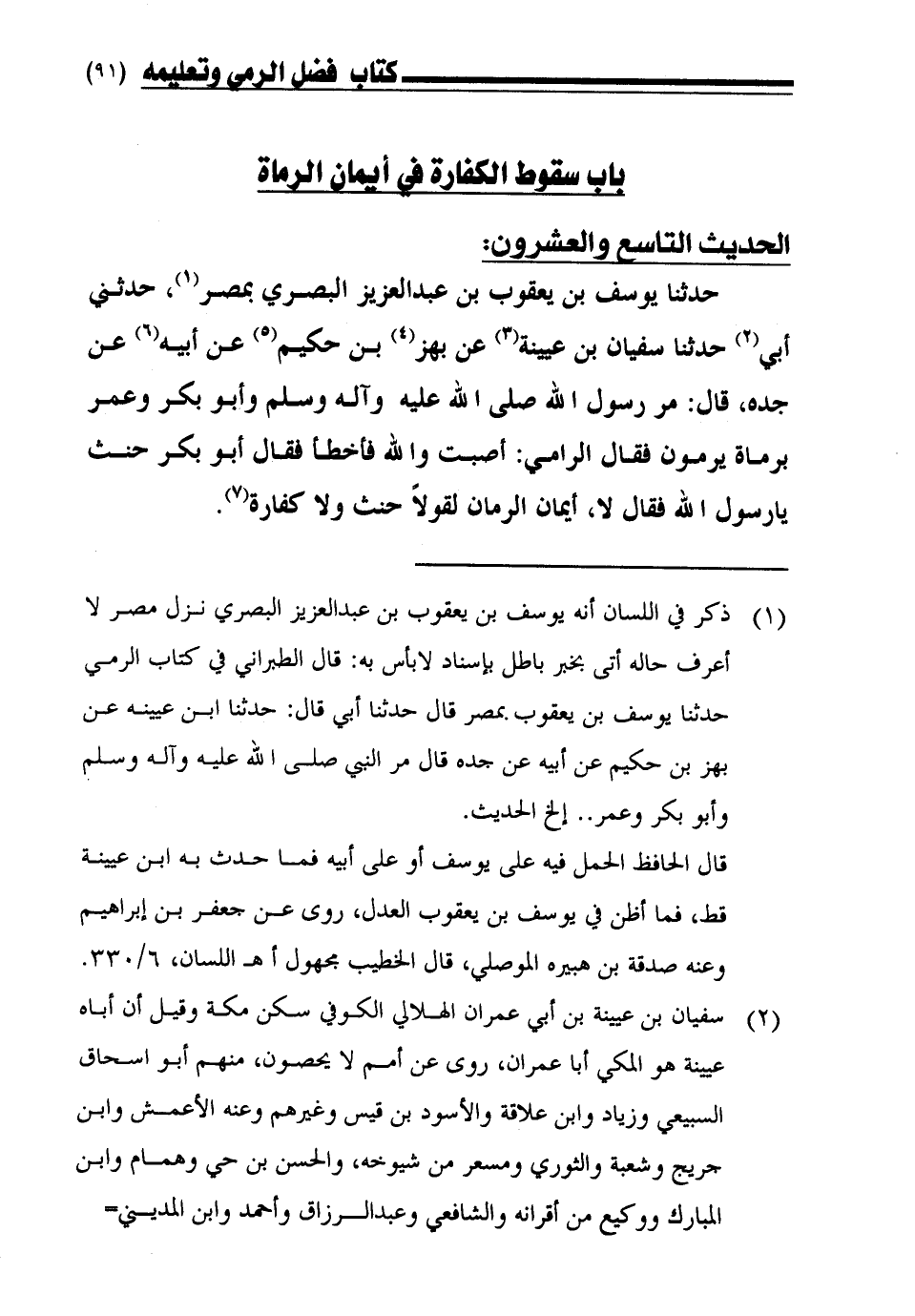 32 - حَدَّثَنَا يُوسُفُ بْنُ يَعْقُوبَ بْنِ عَبْدِ الْعَزِيزِ الثَّقَفِيُّ الْبَصْرِيُّ، بِمِصْرَ: حَدَّثَنِي أَبِي، حَدَّثَنَا سُفْيَانُ بْنُ عُيَيْنَةَ، عَنْ بَهْزِ بْنِ حَكِيمٍ، عَنْ أَبِيهِ، عَنْ جَدِّهِ، قَالَ: مَرَّ النَّبِيُّ صَلَّى اللَّهُ عَلَيْهِ وَسَلَّمَ وَأَبُو بَكْرٍ، وَعُمَرُ بِرُمَاةٍ يَرْمُونَ، فَقَالَ الرَّامِي: أَصَبْتُ وَاللَّهِ، فَأَخْطَأَ , فَقَالَ أَبُو بَكْرٍ: حَنِثَ يَا رَسُولَ اللَّهِ؟ فَقَالَ: «§لَا , أَيْمَانُ الرُّمَاةِ لَغْوٌ؛ لَا حِنْثٌ , وَلَا كَفَّارَةٌ»