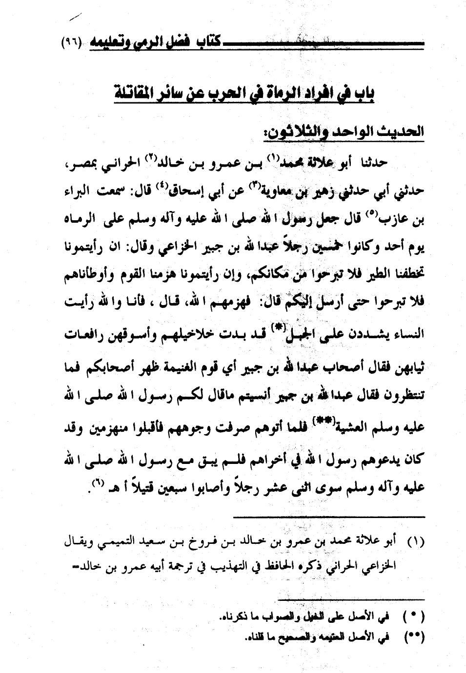 34 - حَدَّثَنَا أَبُو عُلَاثَةَ بْنُ عَمْرِو بْنِ خَالِدٍ الْحَرَّانِيُّ، بِمِصْرَ: حَدَّثَنِي أَبِي، حَدَّثَنِي زُهَيْرُ بْنُ مُعَاوِيَةَ، عَنْ أَبِي إِسْحَاقَ، قَالَ: سَمِعْتُ الْبَرَاءَ بْنَ عَازِبٍ، قَالَ: جَعَلَ رَسُولُ اللَّهِ صَلَّى اللَّهُ عَلَيْهِ وَسَلَّمَ عَلَى الرُّمَاةِ يَوْمَ أُحُدٍ، وَكَانُوا خَمْسِينَ رَجُلًا، عَبْدَ اللَّهِ بْنِ جُبَيْرٍ الْخُزَاعِيَّ، وَقَالَ: «§إِنْ رَأَيْتُمُونَا تَخْطَفُنَا الطَّيْرُ فَلَا تَبْرَحُوا مِنْ مَكَانِكُمْ، وَإِنْ رَأَيْتُمُونَا هَزَمْنَا الْقَوْمَ وَأَوْطَأْنَاهُمْ , فَلَا تَبْرَحُوا حَتَّى أُرْسِلَ إِلَيْكُمْ» قَالَ: فَهَزَمَهُمُ اللَّهُ، قَالَ: فَأَنَا وَاللَّهِ رَأَيْتُ النِّسَاءَ يَشُدُّونَ عَلَى الْخَيْلِ قَدْ بَدَتْ خَلَاخِيلُهُنَّ وَأَسْوُقُهُنَّ رَافِعَاتٍ ثِيَابَهُنَّ، فَقَالَ أَصْحَابُ عَبْدِ اللَّهِ بْنِ جُبَيْرٍ: الْغَنِيمَةَ أَيْ قَوْمُ الْغَنِيمَةَ ظَهْرَ أَصْحَابُكُمْ فَمَاذَا تَنْتَظِرُونَ؟ فَقَالَ عَبْدُ اللَّهِ بْنُ جُبَيْرٍ: أَنَسِيتُمْ مَا قَالَ لَكُمْ رَسُولُ اللَّهِ صَلَّى اللَّهُ عَلَيْهِ وَسَلَّمَ؟ قَالُوا: وَاللَّهِ لَنَأْتِيَنَّ النَّاسَ، فَلَنُصِيبَنَّ مِنَ الْغَنِيمَةِ، فَلَمَّا أَتَوْهُمْ؛ صُرِفَتْ وجُوهُهُمْ، فَأَقْبَلُوا، وَقَدْ كَانَ يَدْعُوهُمُ الرَّسُولُ فِي أُخْرَاهُمْ، فَلَمْ يَبْقَ مَعَ رَسُولِ اللَّهِ صَلَّى اللَّهُ عَلَيْهِ وَسَلَّمَ غَيْرَ اثْنَيْ عَشَرَ رَجُلًا، وَأَصَابُوا سَبْعِينَ قَتِيلًا
