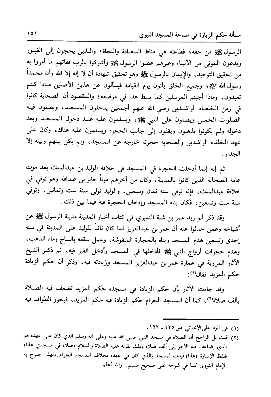 (2) قلت بل الراجح أن الصلاة في مسجد النبي صلى الله عليه وعلى آله وسلم الذي كان على عهده هو الذي يضاعف فيه الأجر إلى ألف صلاة وذلك لقوله عليه الصلاة والسلام، صلاة في مسجدي هذا فلفظ الإشارة " هذا " قيدت المسجد بالذي كان في عهده بخلاف المسجد الحرام ولهذا صرح به الإمام النووي كما في شرحه على صحيح مسلم، والله أعلم.