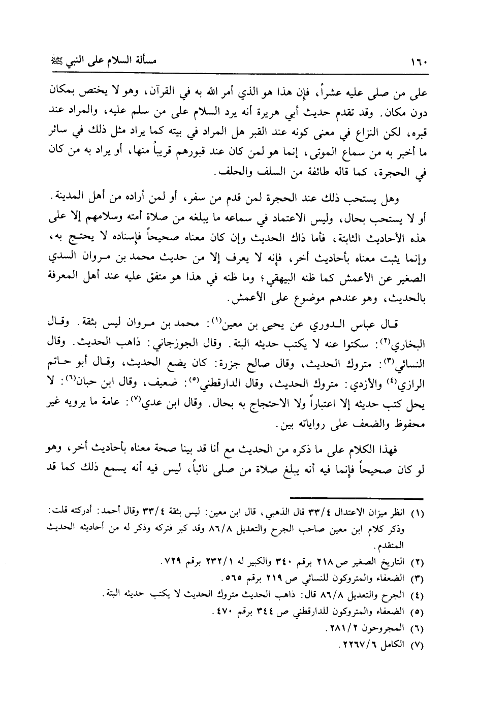 وهل يستحب ذلك عند الحجرة لمن قدم من سفر أو لمن أراده من أهل المدينة أولاً يستحب بحال، وليس الاعتماد في سماعه ما يبلغه من صلاة أمته وسلامهم إلا على هذه الأحاديث الثابتة، فأما ذاك الحديث وإن كان معناه صحيحاً فإسناده لا يحتج به، وإنما يثبت معناه بأحاديث أخر، فإنه لا يعرف إلا من حديث محمد بن مروان السدي الصغير عن الأعمش كما ظنه البيهقي، وما ظنه في هذا هو متفق عليه عند أهل المعرفة بالحديث، وهو عندهم موضوع على الأعمش.