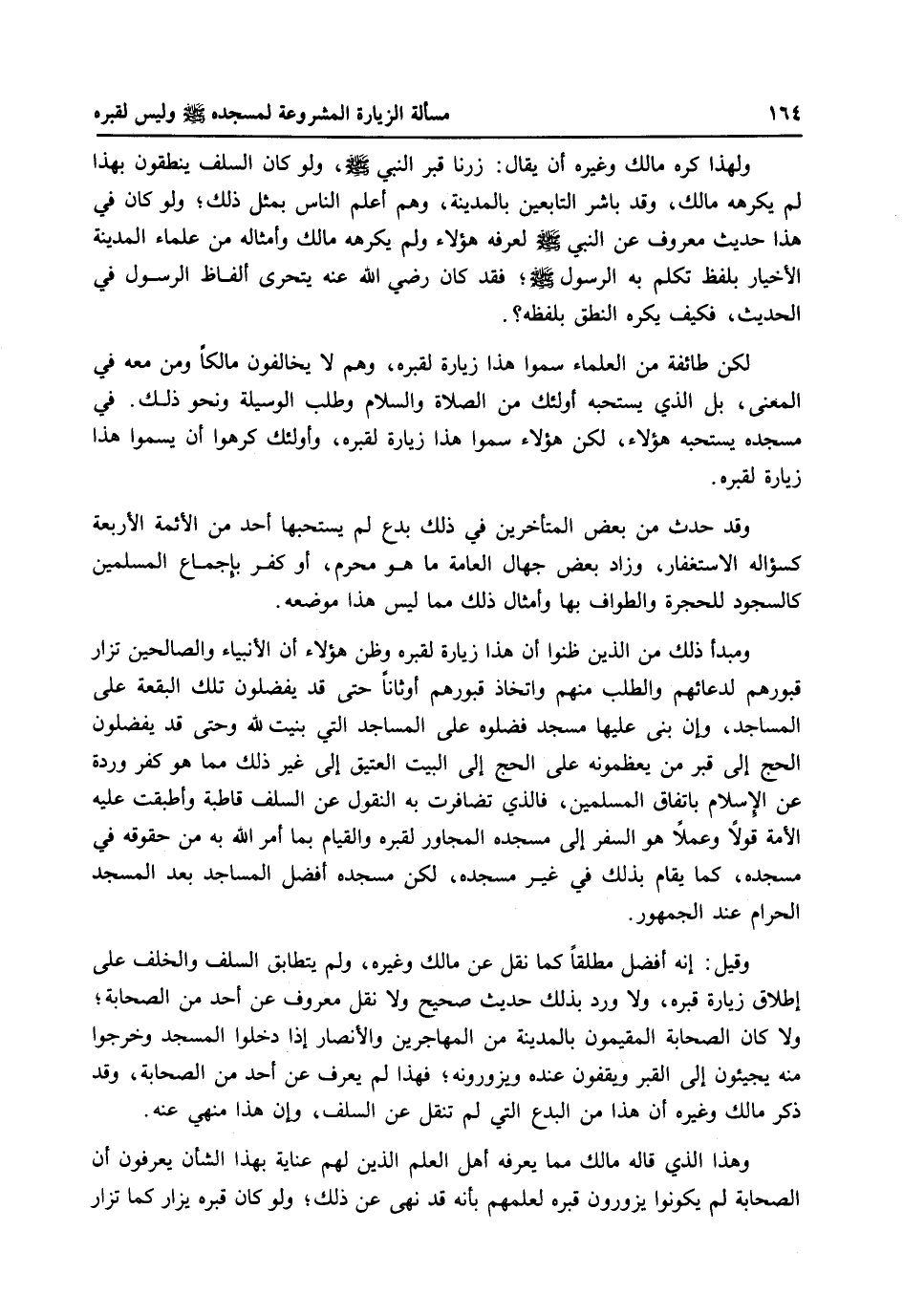 ولهذا كره مالك وغيره أن يقال: زرنا قبر النبي صلى الله عليه وسلم، ولو كان السلف ينطقون بهذا لم يكرهه مالك، وقد باشر التابعين بالمدينة، وهم أعلم الناس بمثل ذلك، ولو كان في هذا حديث معروف عن النبي صلى الله عليه وسلم لعرفة هؤلاء ولم يكرهه مالك وأمثاله من علماء المدينة الأخبار بلفظ تكلم به الرسول صلى الله عليه وسلم فقد كان رضي الله عنه يتحرى ألفاظ الرسول في الحديث، فكيف يكره النطق بلفظه؟