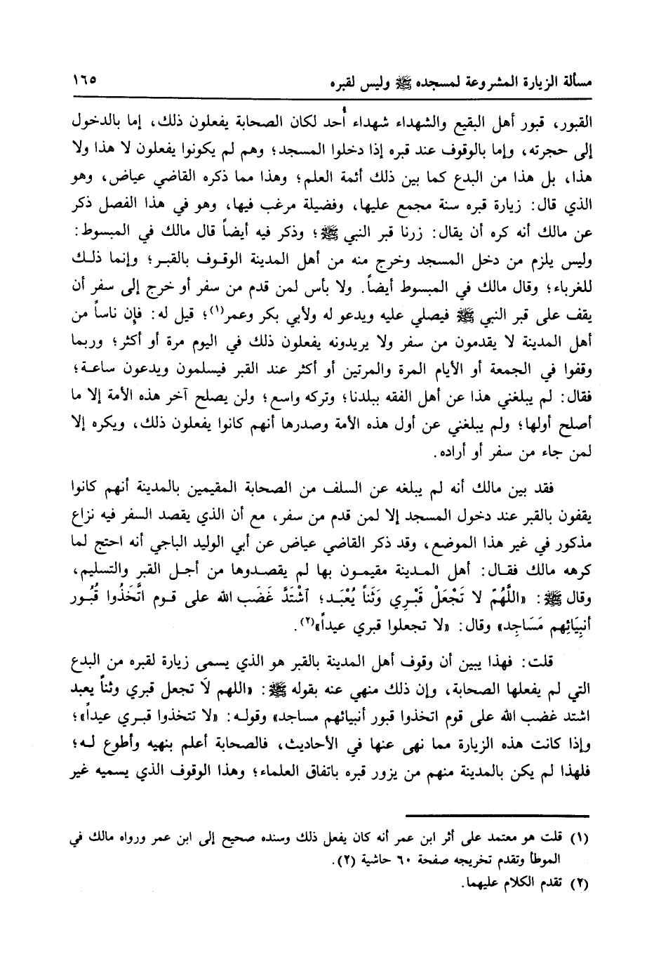 فقد بين مالك أنه لم يبلغ عن السلف من الصحابة المقيمين بالمدينة أنهم كانوا يقفون بالقبر عند دخول المسجد إلا لمن قدم من سفر، مع أن الذي يقصد السفر فيه نزاع مذكور في غير هذا الموضع، وقد ذكر القاضي عيا عن أبي الوليد الباجي أنه احتج لما كره مالك فقال: أهل المدينة مقيمون بها لم يقصدوها من أجل القبر والتسليم، وقال: ((اللهم لا تجعل قبري وثناً يعبد، أشتد غضب الله على قوم اتخذوا قبور أنبيائهم مساجد)) وقال: ((لا تجعلوا قبري عيداً)) (2) .