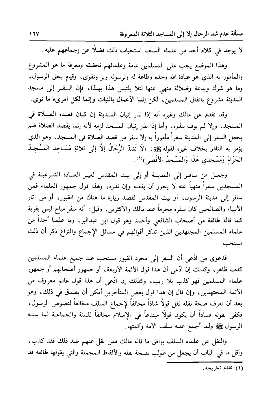 وجعل من سافر إلى المدينة أو إلى بيت المقدس لغير العبادة الشرعية في المسجدين سفراً منهياً عنه لا يجوز أن يفعله وأن نذره، وهذا قول جمهور العلماء فمن سافر إلى مدينة الرسول، أو بيت المقدس لقصد زيارة ما هناك من القبور، أومن آثار الأنبياء والصالحين كان سفره محرماً عند مالك والأكثرين، وقيل: أنه سفر مباح ليس بقربه كمال قاله طائفة من أصحاب الشافعي وأحمد وهو قول ابن عبد البر، وما علمنا أحد علماء المسلمين المجتهدين الذين تذكر أقوالهم في مسائل الإجماع والنزاع ذكر أن ذلك مستحب.