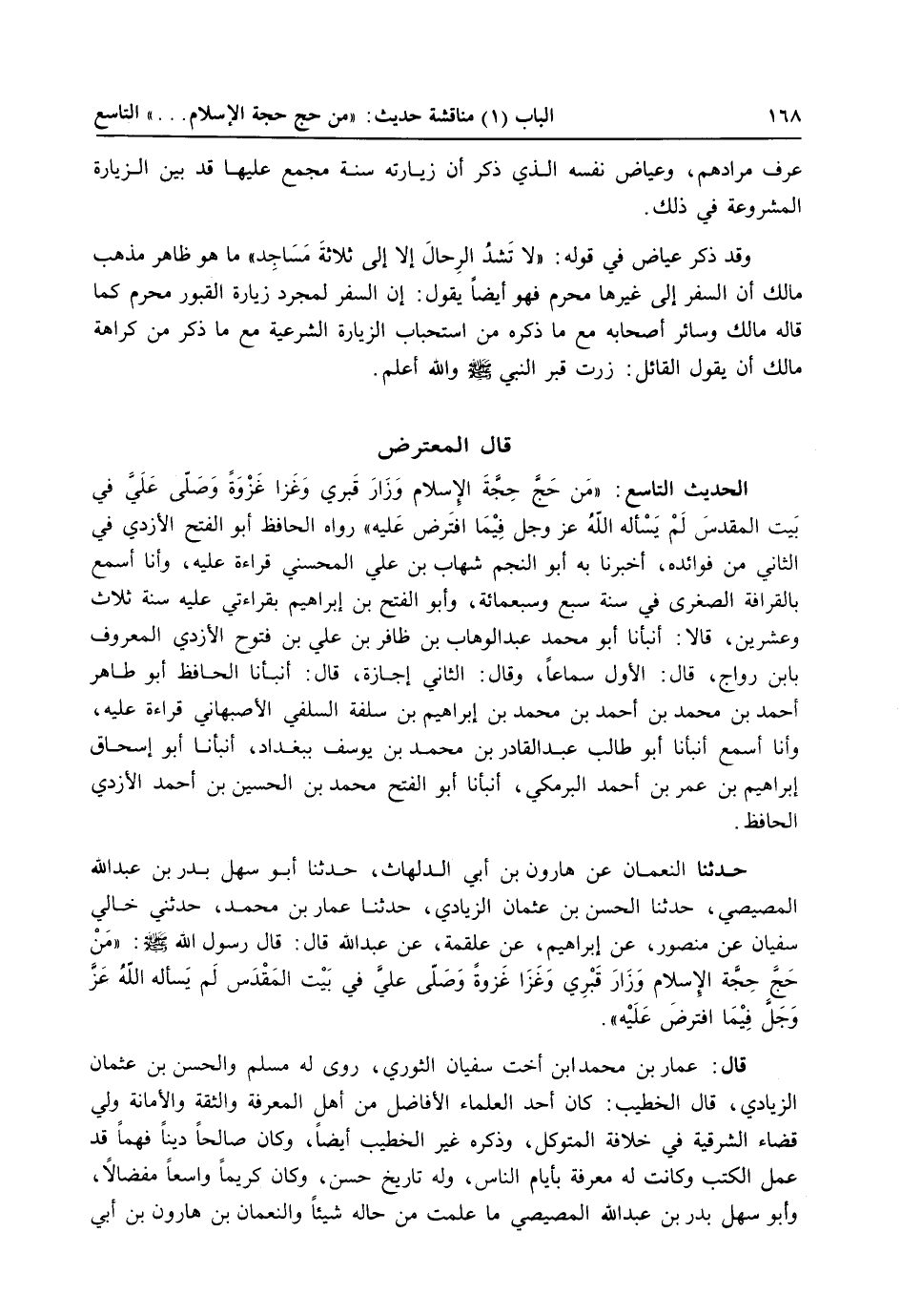الحديث التاسع: ((من حج حجة الإسلام وزار قبري وغزا غزوة وصلى علي في بيت المقدس لم يسأله الله عز وجل فيما افترض عليه، رواه الحافظ أبو الفتح الأزدي في الثاني من فوائد، أخبرنا به أبو النجم شهاب بن علي المحسني قراءة عليه وإنا اسمع بالقرافة الصغرى في سنة سبع وسبعمائة، وأبو الفتح بن إبراهيم بقراءتي عليه سنة ثلاث وعشرين، قالات: أنبأنا أبو محمد عبد الوهاب بن ظافر بن علي بن فتوح الأزدي المعروف بابن رواج، قال: الأول سماعاً، وقال: الثاني إجازة، قال: أنبأنا الحافظ أبو طاهر أحمد بن محمد بن أحمد بن محمد بن إبراهيم بن سلفة السلفي الأصبهاني قراءة عليه، وأنا أسمع أنبأنا أبو طالب عبد القادر بن محمد بن يوسف بغداد، أنبأنا أبو إسحاق إبراهيم بن عمر بن أحمد البرمكي، أنبأنا أبو الفتح محمد بن الحسين بن أحمد الأزدي الحافظ.