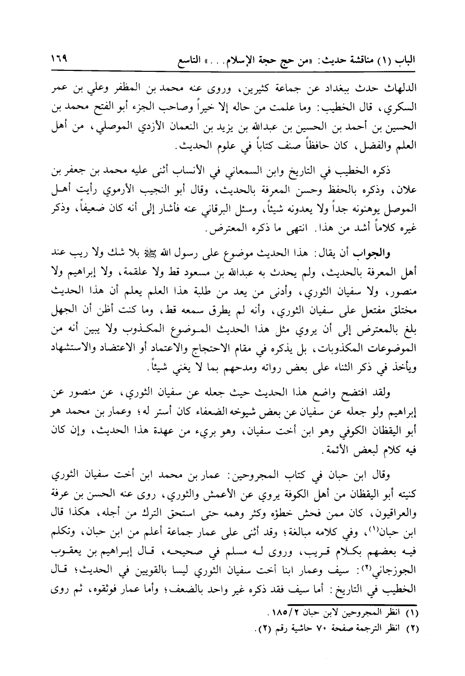 ولقد افتضح واضع هذا الحديث حيث جعله عن سفيان الثوري، عن منصور عن إبراهيم ولو جعله عن سفيان عن بعض شيوخه الضعفاء كان استر له، وعمار بن محمد هو أبو اليقظان الكوفي وهو ابن أخت سفيان، وهو بريء من عهده هذا الحديث، وإن كان فيه كلام لبعض الأئمة.