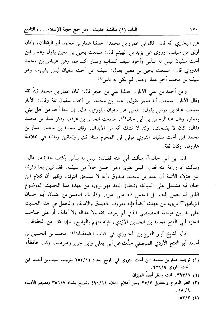 (1) ترجمة عمار بن محمد بن أخت الثوري في تاريخ بغداد 12/252 وترجمة سيف بن أحمد ابن أخت الثوري 9/226.