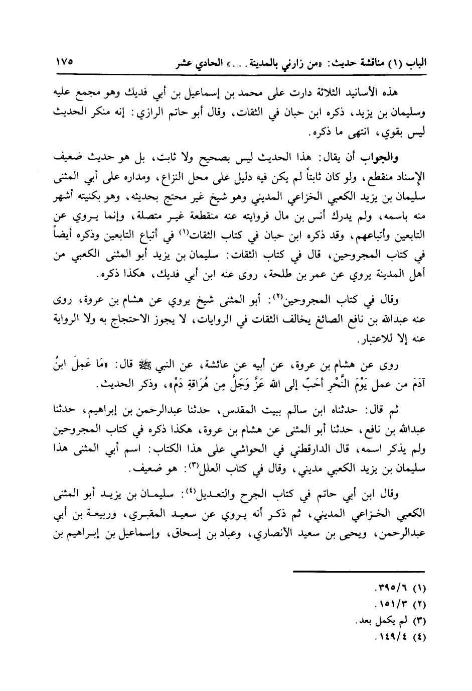 ثم قال: حدثناه ابن سالم ببيت المقدس، حدثنا عبد الرحمن بن إبراهيم، حدثنا عبد الله بن نافع، حدثنا أبو المثنى عن هشام بن عروة، هكذا ذكره في كتاب المجروحين ولم يذكر اسمه، قال الدارقطني في الحواشي على هذا الكتاب، اسم ابي المثنى هذا سليمان بن يزيد الكعبي مديني، وقال في كتاب العلل (3) : هو ضعيف.