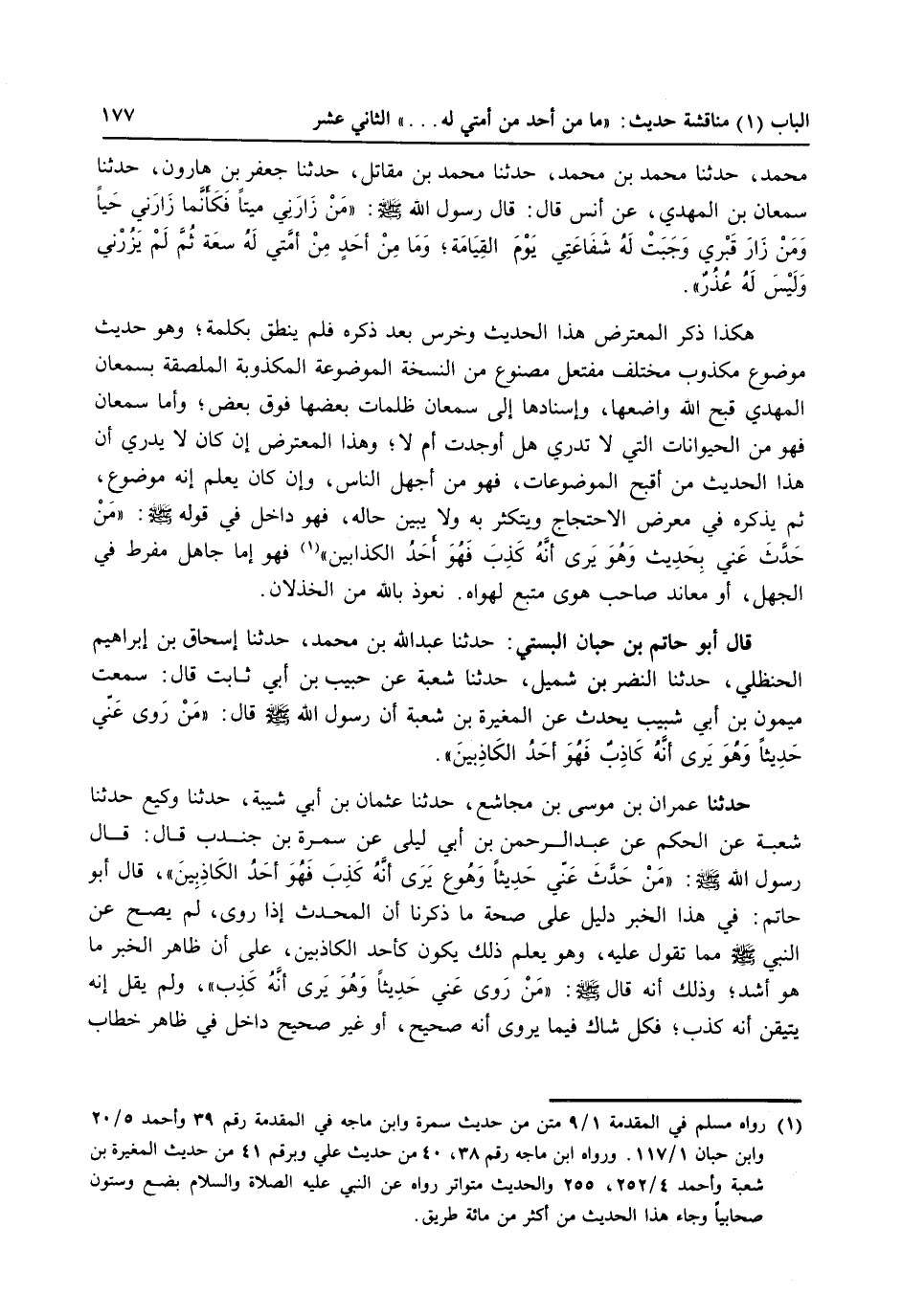 (1) رواه مسلم في المقدمة 1/9 متن من حديث سمرة وابن ماجه في المقدمة رقم 39وأحمد 5/20 وابن حبان 1/117، ورواه ابن ماجه رقم 38،، 40 من حديث علي وبرقم 41 من حديث المغيرة بن شعبة وأحمد 4/252، 255 والحديث متواتر عن النبي عليه الصلاة والسلام بضع وستون صحابياً وجاء هذا الحديث من أكثر من مائة طريق.