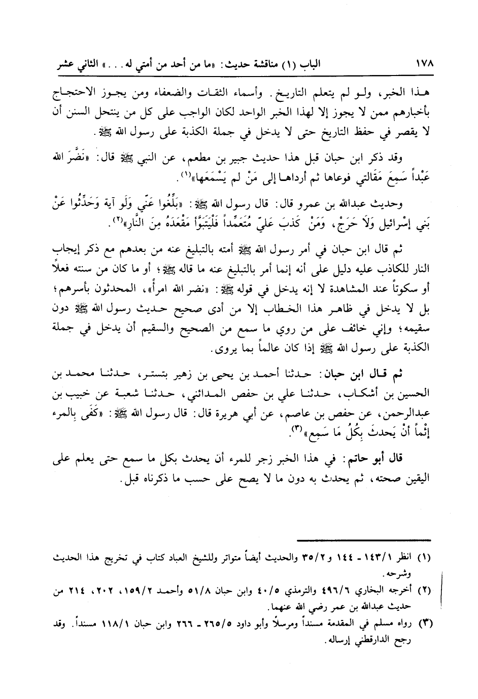 ثم قال ابن حبان في أمر رسول الله أمته بالتبليغ عنه من بعدهم مع ذكر إيجاب النار للكاذب عليه دليل على أنه إنما أمر بالتبليغ عنه ما قاله صلى الله عليه وسلم، أو ماكان من سننه فعلاً أوة سكوتا عند المشاهدة لا إنه يدخل في قوله: ((نضر الله امرأ)) المحدثون بأسرهم، بل لا يدخل في ظاهر هذا الخطاب إلا من أدى صحيح حديث رسول الله دون سقيمة، وإني خائف على من روي ما سمع من الصحيح والسقيم أن يدخل في جملة الكذبة على رسول الله صلى الله عليه وسلم إذا كان عالماً بما يروي.