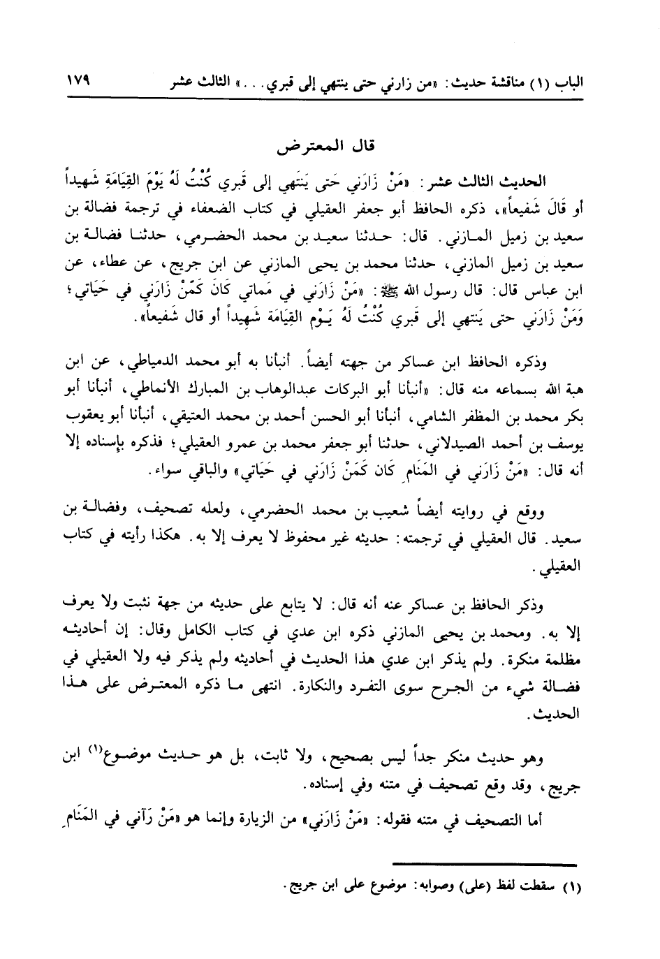 الحديث الثالث عشر: ((من زارني حتى ينتهي إلى قبري كنت له يوم القيامة شهيداً أو قال شفيعاً)) ذكره الحافظ أبو جعفر العقبلي في كتاب الضعفاء في ترجمة فضالة بن سعيد بن زميل المازني، قال: حدثنا سعيد بن محمد الحضرمي، حدثنا فضالة بن سعيد بن زميل المازني، حدثنا محمد بن يحيى المازني عن ابن جريج، عن عطاء، عن ابن عباس قال: قال رسول صلى الله عليه وسلم: ((من زارني في مماتي كان كمن زارني في حياتي، ومن زارني حتى ينتهي إلى قبري كنت له يوم القيامة شهيداً أو قاله شفيعاً)) .