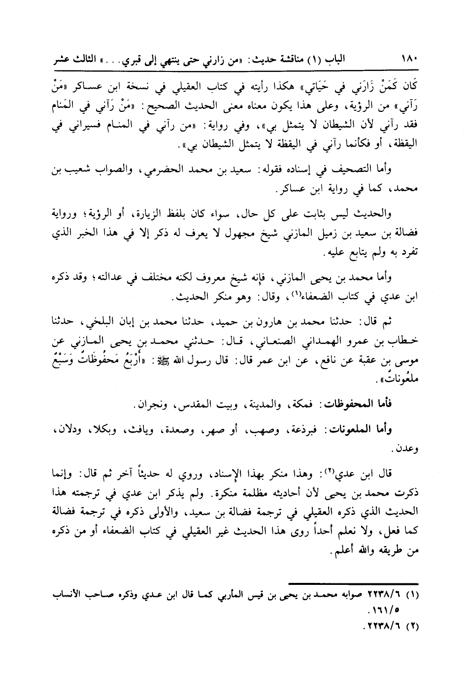 قال ابن عدي (2) : وهذا منكر بهذا الإسناد، وروي له حديثاً آخر ثم قال: وإنما ذكرت محمد بن يحيى لأن أحاديثه مظلمة منكرة، ولم يذكر ابن عدي في ترجمته هذا الحديث الذي ذكره العقيلي في ترجمة فضالة بن سعيد، والأولى ذكره في ترجمة فضالة كما فعل، ولا نعلم أحداً روى هذا الحديث غير العقيلي في كتاب الضعفاء، أو من ذكره من طريقة والله أعلم.