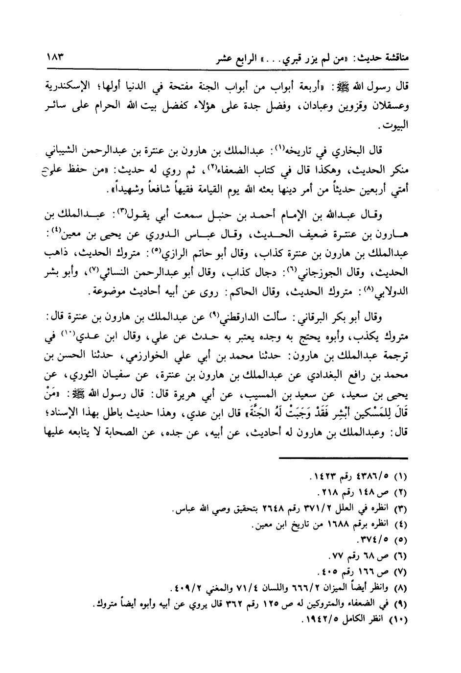 قال البخاري في تاريخه (1) : عبد الملك بن هارون بن عنترة بن عبد الرحمن الشيباني منكر الحديث، وهكذا قال في كتاب الضعفاء (2) ، ثم روي له حديث: ((من حفظ على أمتي أربعين حديثاً من أمر دينها بعثه الله يوم القيامة فقيهاً شافعاً وشهيداً))