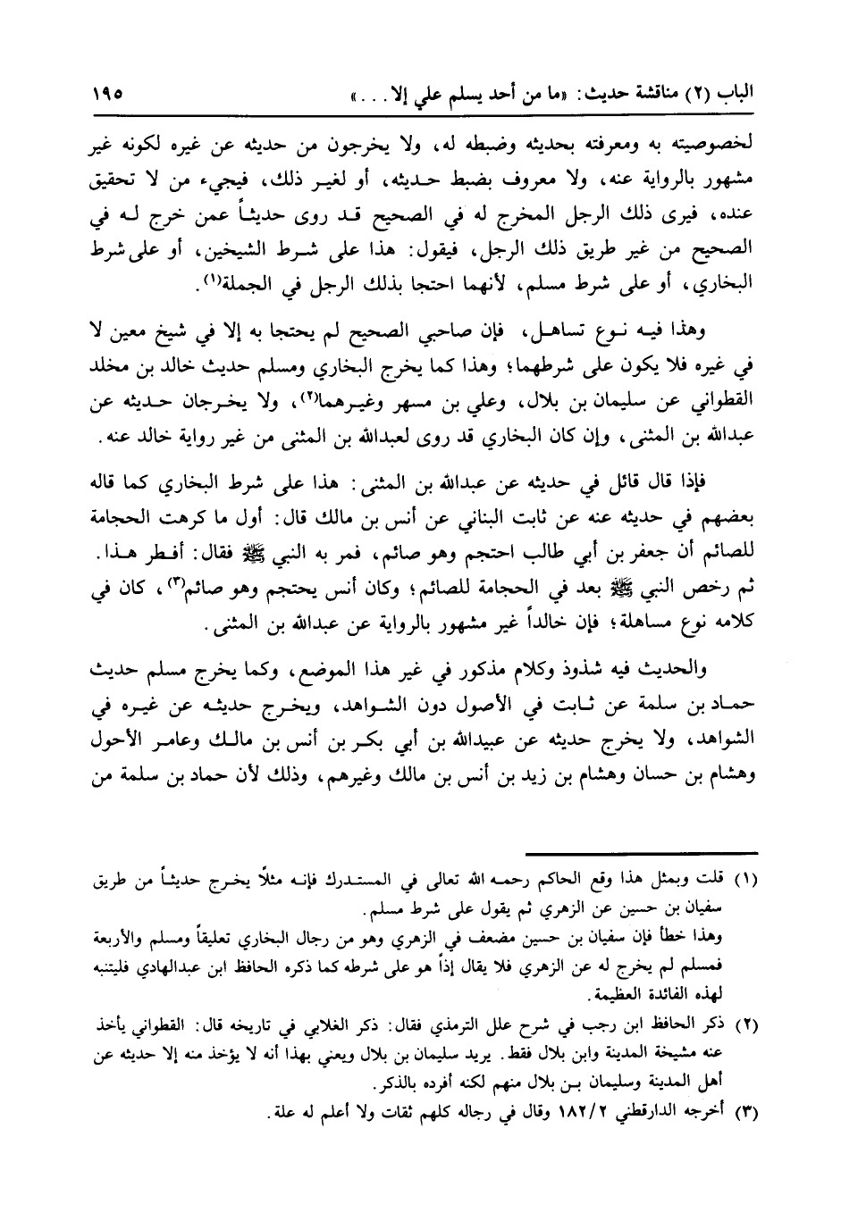فإذا قال قائل في حديثه عن عبد الله بن المثنى: هذا على شرط البخاري كما قاله بعضهم في حديثه عنه عن ثابت البنائي عن أنس بن مالك قال: أول ما كرهت الحجامة للصائم أن جعفر بن أبي طالب احتجم وهو صائم، فمر به النبي صلى الله عليه وسلم فقال: أفطر هذا ثم رخص النبي بعد في الحجامة للصائم، وكان أنس يحتجم وهو صائم (3) ، كان في كلامه نوع مساهلة، فإن خالداً غير مشهور بالرواية عن عبد الله بن المثنى.