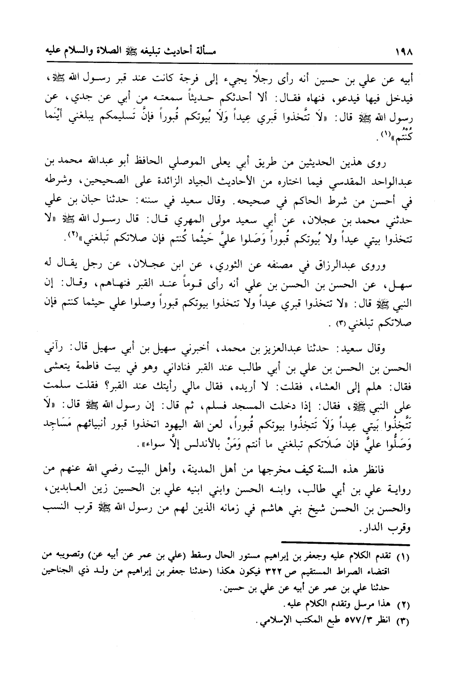 وروى عبد الرزاق في مصنفه عن الثوري، عن ابن عجلان، عن رجل يقال له سهل، عن الحسن بن الحسن بن علي أنه رأى قوماً عند القبر فنهاهم، وقال: إن النبي صلى الله عليه وسلم قال: ((لا تتخذوا قبري عيداً ولا تتخذوا بيوتكم قبوراً وصلوا علي حيثما كنتم فإن صلاتكم تبلغني)) (3) .