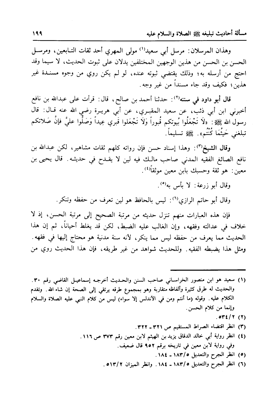 قال أبو داود في سننه (2) : حدثنا أحمد بن صالح، قال: قرأت على عبد الله بن نافع أخبرني ابن أبي ذئب، عن سعيد المقيري، عن أبي هريرة رضي الله عنه قال: قال رسول الله صلى الله عليه وسلم: ((لا تجعلوا بيوتكم قبوراً ولا تجعلوا قبري عيداً وصلوا علي فإن صلاتكم تبلغني حيثما كنتم)) صلى الله عليه وسلم تسليماً.