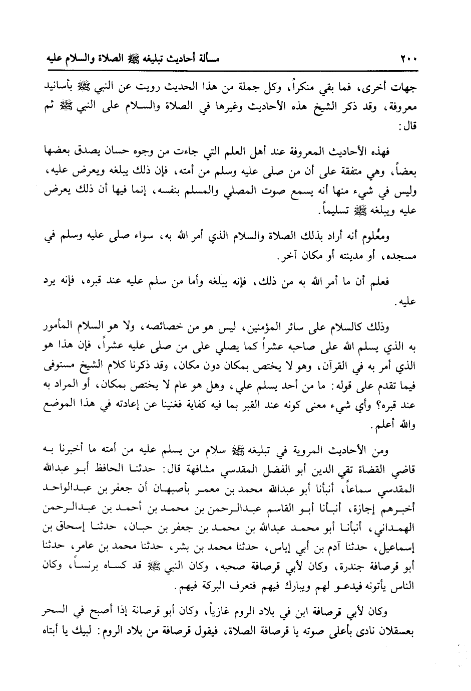 ومن الأحاديث المروية في تبليغه صلى الله عليه وسلم سلام من يسلم عليه من أمته ما أخبرنا به قاضي القضاة تقي الدين أبو الفضل المقدسي مشافهة قال: حدثنا الحافظ أبو عبد الله المقدسي سماعاً، أنبأنا أبو عبد الله محمد بن معمر بأصبهان أن جعفر بن عبد الواحد أخبرهم إجازة، أنبأنا أبو القاسم عبد الرحمن بن محمد بن أحمد بن عبد الرحمن الهمداني، أنبأنا أبو محمد عبد الله بن محمد بن جعفر بن بشر، حدثنا محمد بن عامر،حدثنا أبو قرصافة جندرة، وكان لأبي قرصافة صحبه، وكان النبي صلى الله عليه وسلم قد كساه برنساً، وكان الناس يأتونه فيدعو لهم ويبارك فيهم فتعرف البركة فيهم.