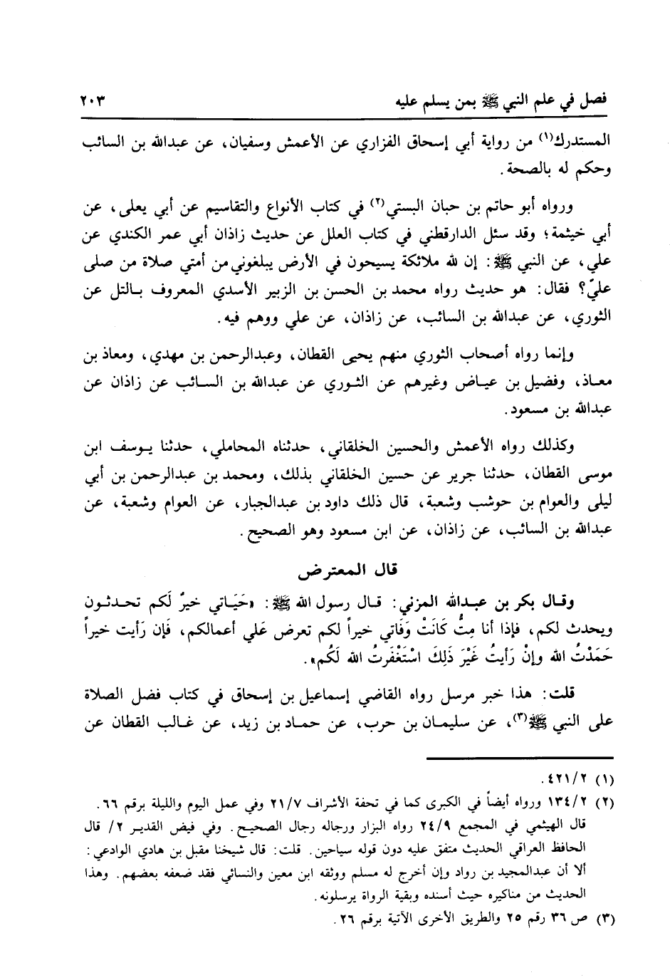 وقال بكر بن عبد الله المزني، قال رسول الله صلى الله عليه وسلم ((حياتي خير لكم تحدثون ويحدث لكم، فإذا أنا مت كانت وفاتي خير لكم تعرض علي أعمالكم، فإن رأيت خير لكم تحدثون ويحدث لكم، فإذا أنا مت كانت وفاتي خير لكم تعرض علي أعمالكم، فإن رأيت خيراً حمدت الله وإن رأيت غير ذلك استغفرت الله لكم)) .