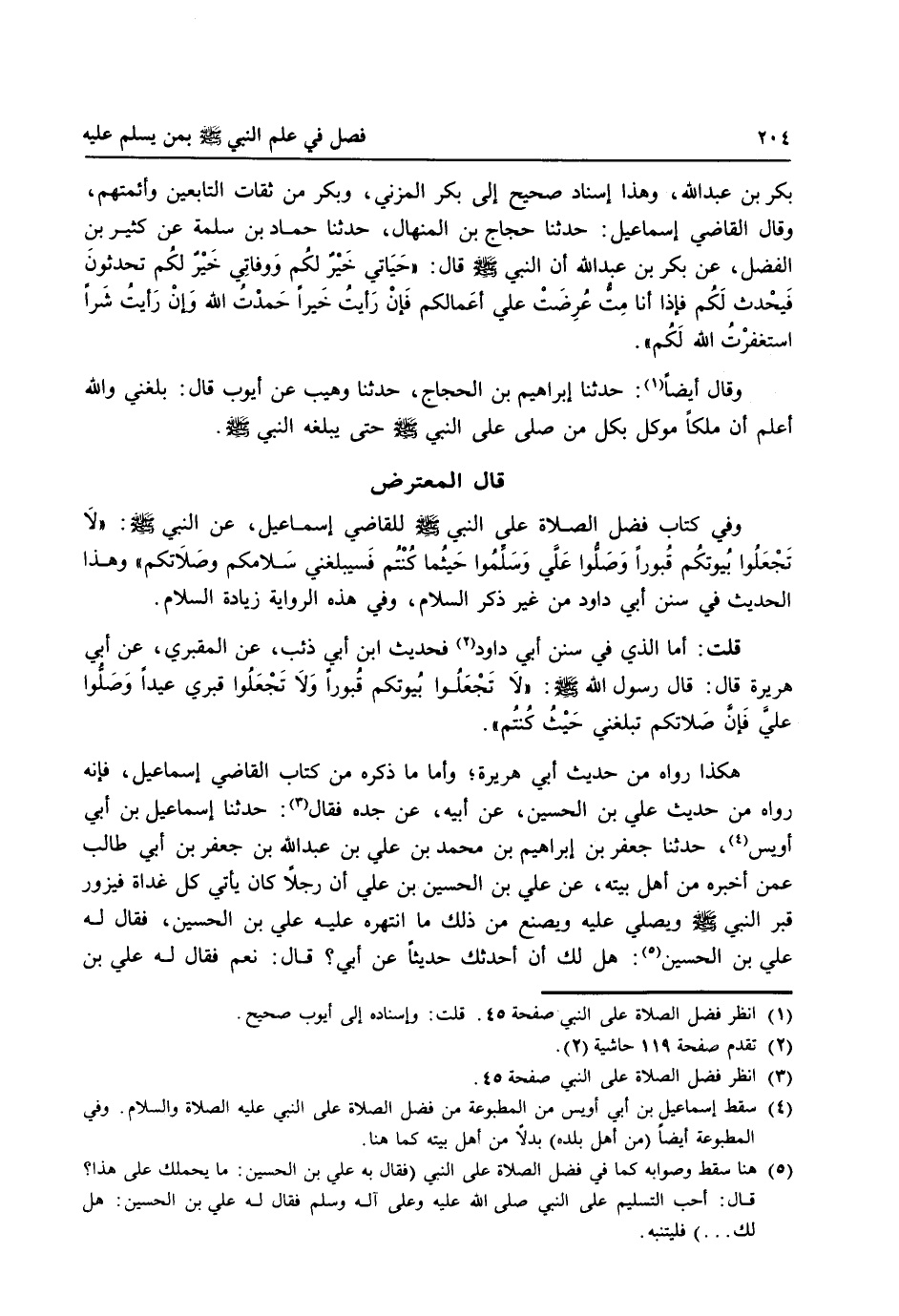 (4) سقط إسماعيل بن أبي اويس من المطبوعة من فضل الصلاة على النبي عليه الصلاة والسلام، وفي المطبوعة أيضاً (من أهل بلده) بدلاً من أهل بيته كما هنا.