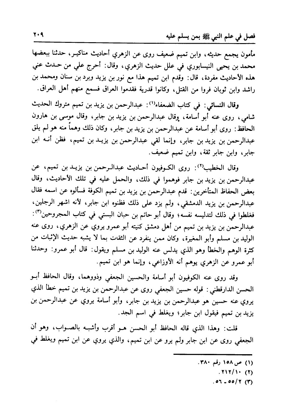 وقال الخطيب (2) : روى الكوفيون أحاديث عبد الرحمن بن يزيد بن تميم، عن عبد الرحمن بن يزيد بن جابر فوهموا في ذلك،والحمل عليه في تلك الأحاديث، وقال بعض الحفاظ المتأخرين: قدم عبد الرحمن بن يزيد على ذلك فظنوه ابن جابر، لأنه أشهر الرجلين، فغلطوا في ذلك لتدليسه نفسه، وقال أبو حاتم بن حبان البستي في كتاب المجروحين (3) : عبد الرحمن بن يزيد بن تميم من أهل دمشق كنيته أبو عمرو ويروي عن الزهري، وروى عنه الوليد بن مسلم وأبو المغيرة، وكان ممن ينفرد عن الثقات بما لا يشبه حديث الإثبات من كثرة الوهم والخطأ وهو اذلي يدلس عنه الوليد بن مسلم ويقول: قال أبو عمرو: حدثنا أبو عمرو عن الزهري يوهم أنه الأزاعي، وإنما هو ابن تميم.