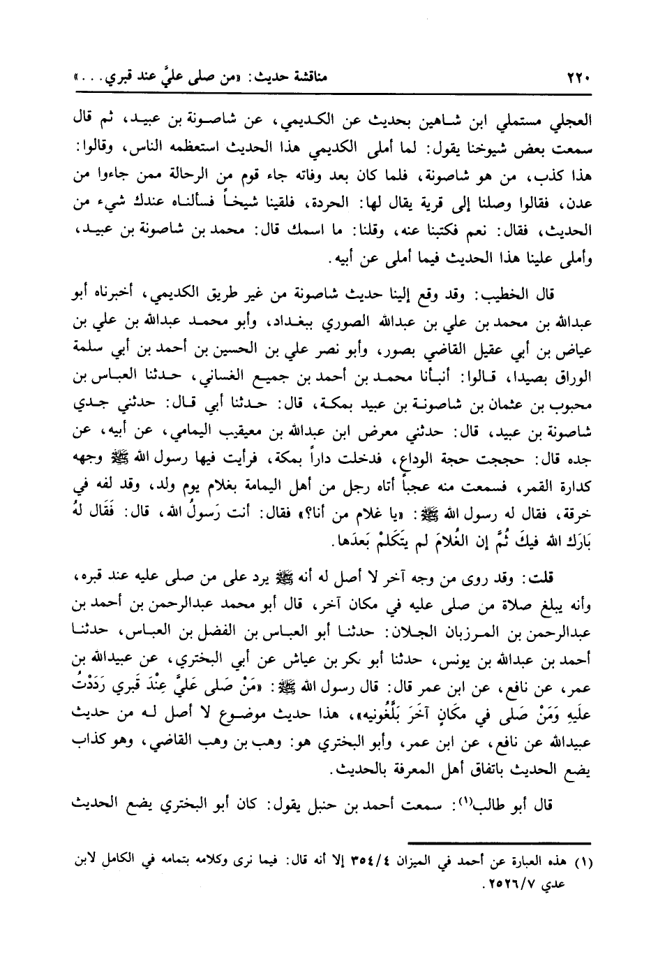 قلت: وقد روى من وجهة أخرى لا أصل له أنه صلى الله عليه وسلم يرد على من صلى عليه عند قبره، وأنه يبلغ صلاة من صلى عليه في مكان آخر، قال أبو محمد عبد الرحمن بن أحمد بن عبد الرحمن بن المرزيان الجلان: حدثنا أبو العباس عن أبي البختري، عن عبيد الله بن عمر، عن نافع، عن ابن عمر قال: قال رسول الله صلى الله عليه وسلم: ((من صلى علي عند قبري رددت عليه ومن صلى في مكان آخر بلغونيه)) ، هذا حديث موضوع لا أصل له من حديث عبيد الله عن نافع، عن ابن عمر،وأبو البختري هو: وهب بن وهب القاضي،وهو كذاب يضع الحديث باتفاق أهل المعرفة بالحديث.