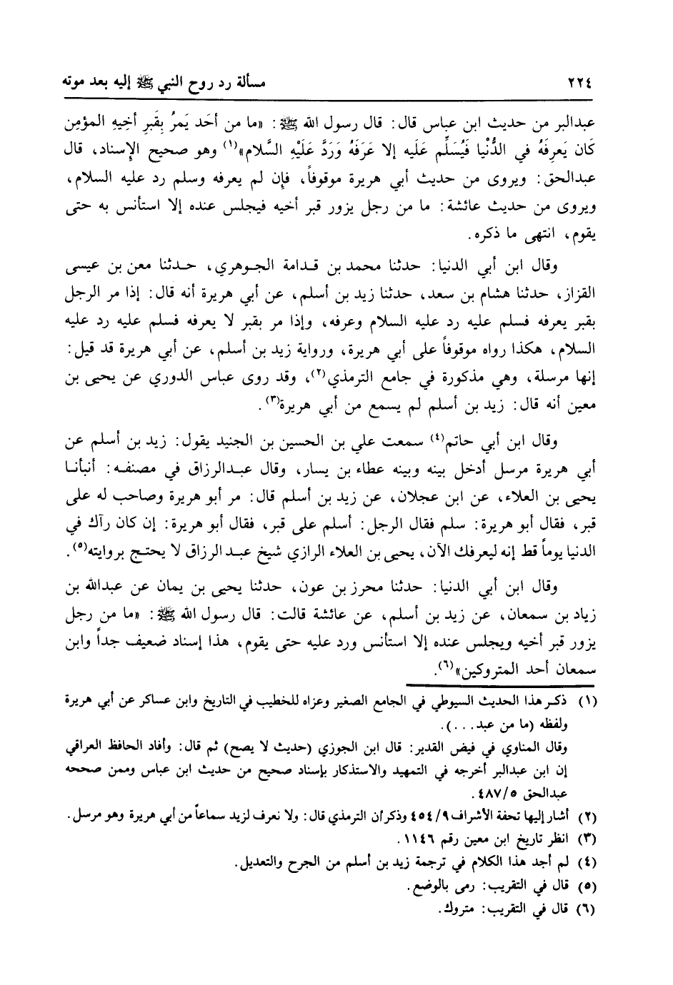 وقال ابن أبي الدنيا: حدثنا محمد بن قدامه الجوهري: حدثنا معن بن عيسى القزاز، حدثنا هشام بن سعد، حدثنا زيد بن أسلم، عن أبي هريرة أه قال: إذا مر الرجل بقبر يعرفه فسل عليه رد عليه السلام وعرفه، وإذا مر بقبر لا يعرفه فسلم عليه رد عليه السلام، هكذا رواه موقوفاً على أبي هريرة، ورواية زيد بن أسلم، عن أبي هريرة قد قيل: إنها مرسلة، وهي مذكورة في جامع الترمذي (2) ، وقد روى عباس الدوري عن يحيى بن معين أنه قال: زيد بن أسلم لم يسمع من أبي هريرة (3) .