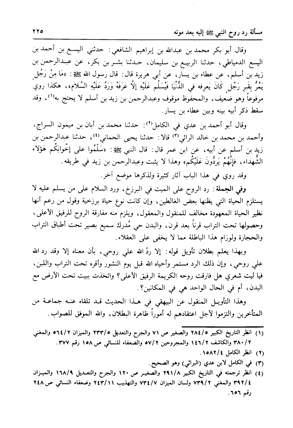 وفي الجملة: رد الروح على الميت في البرزخ، ورد السلام على من يسلم عليه لا يستلزم الحياة التي يظنها بعض الغالطين، وإن كان نوع حياة برزخية وقول من زعم أها نظير الحياة المعهودة مخالف للمنقول والمعقول، ويلزم منه مفارقة الروح للرفيق الأعلى وحصولها تحت التراب قرناً بعد قرن، والبدن حي مدرك سميع بصير تحت أطبقا التراب والحجارة ولوازم هذا الباطلة مما لا يخفى على العقلاء.