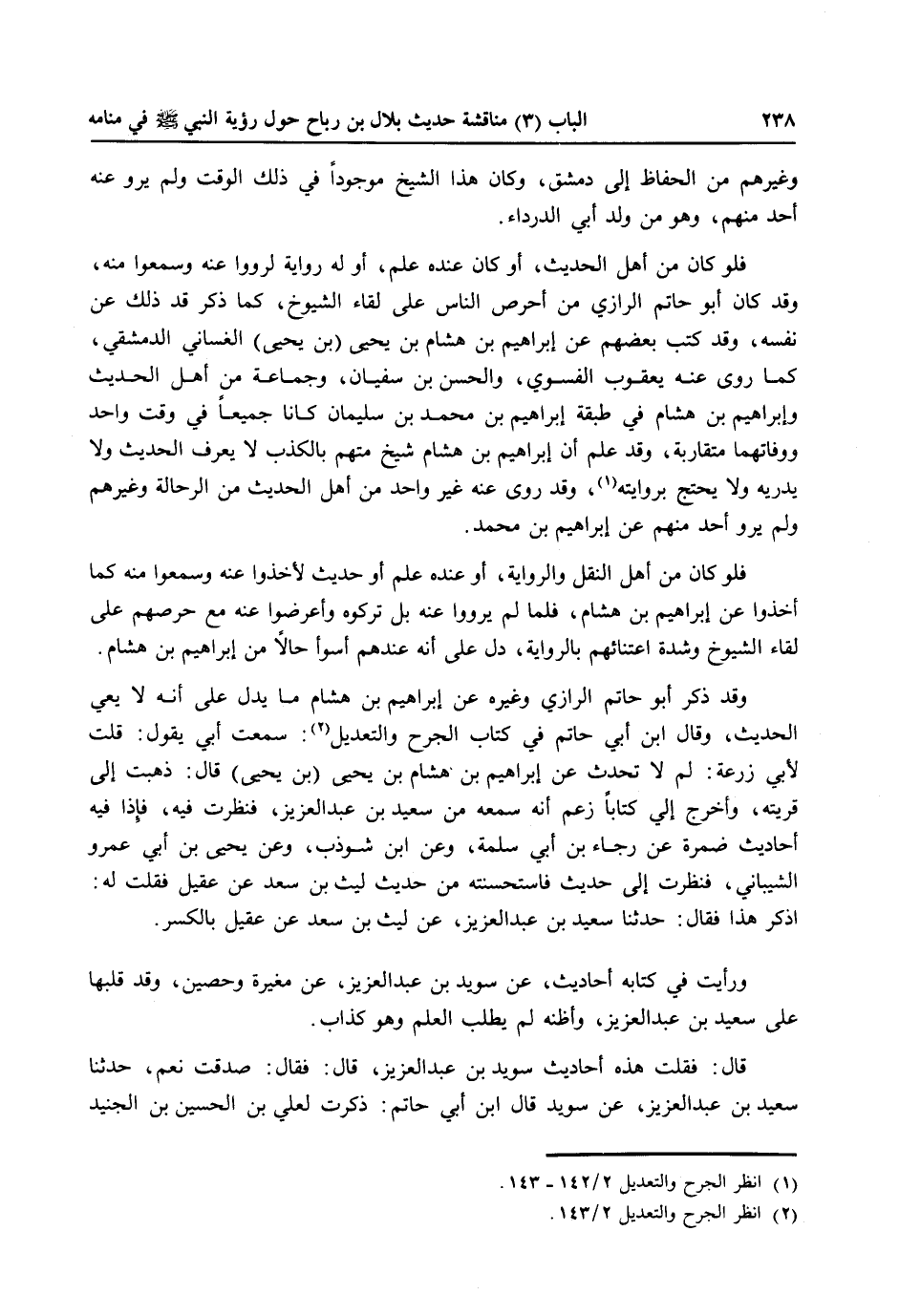 فلو كان من أهل الحديث أو كان عنده علم، أو له رواية لرووا عنه وسمعوا منه، وقد كان أبو حاتم الرازي من أحرص الناس على لقاء الشيوخ، كما ذكر قد ذلك عن نفسه، وقد كتب بعضهم عن إبراهيم بن هشام بن يحيى (بن يحيى) الغساني الدمشقي، كما روى عنه يعقوب الفسوي، والحسن بن سفيان، وجماعة من أهل الحديث وإبراهيم بن هشام في طبقة إبراهيم بن محمد بن سليمان كانا جميعاً في وقت واحد ووفاتهما متقاربة، وقد علم أن إبراهيم بن هشام شيخ متهم بالكذب لا يعرف الحديث ولا يدريه ولا يحتج بروايته (1) ، وقد روى عنه غير واحد من أهل الحديث من الرحالة وغيرهم ولم يرو أحد منهم عن إبراهيم بن محمد.