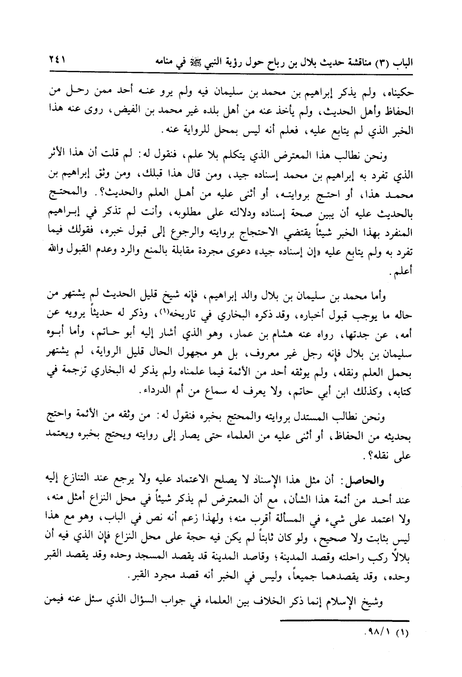 وأما محمد بن سليمان بن بلال والد إبراهيم، فإنه شيخ قليل الحديث لم يشتهر من حاله ما يوجب قبول أخباره، وقد ذكره البخاري في تاريخه (1) ، وذكر له حديثاً يرويه عن أمه، عن جدتها، رواه عن هشام بن عمار، وهو الذي أشار إليه أبو حاتم، وأما أبو سليمان بن بلال فإنه رجل غير معروف، بل هو مجهول الحال قليل الرواية، لم يشتهر بحمل العلم ونقله، ولم يوثقه أحد من الأئمة فيما علمناه ولم يذكر له البخاري ترجمة في كتابه، وكذلك ابن أبي حاتم، ولا يعرف له سماع من أم الدرداء.