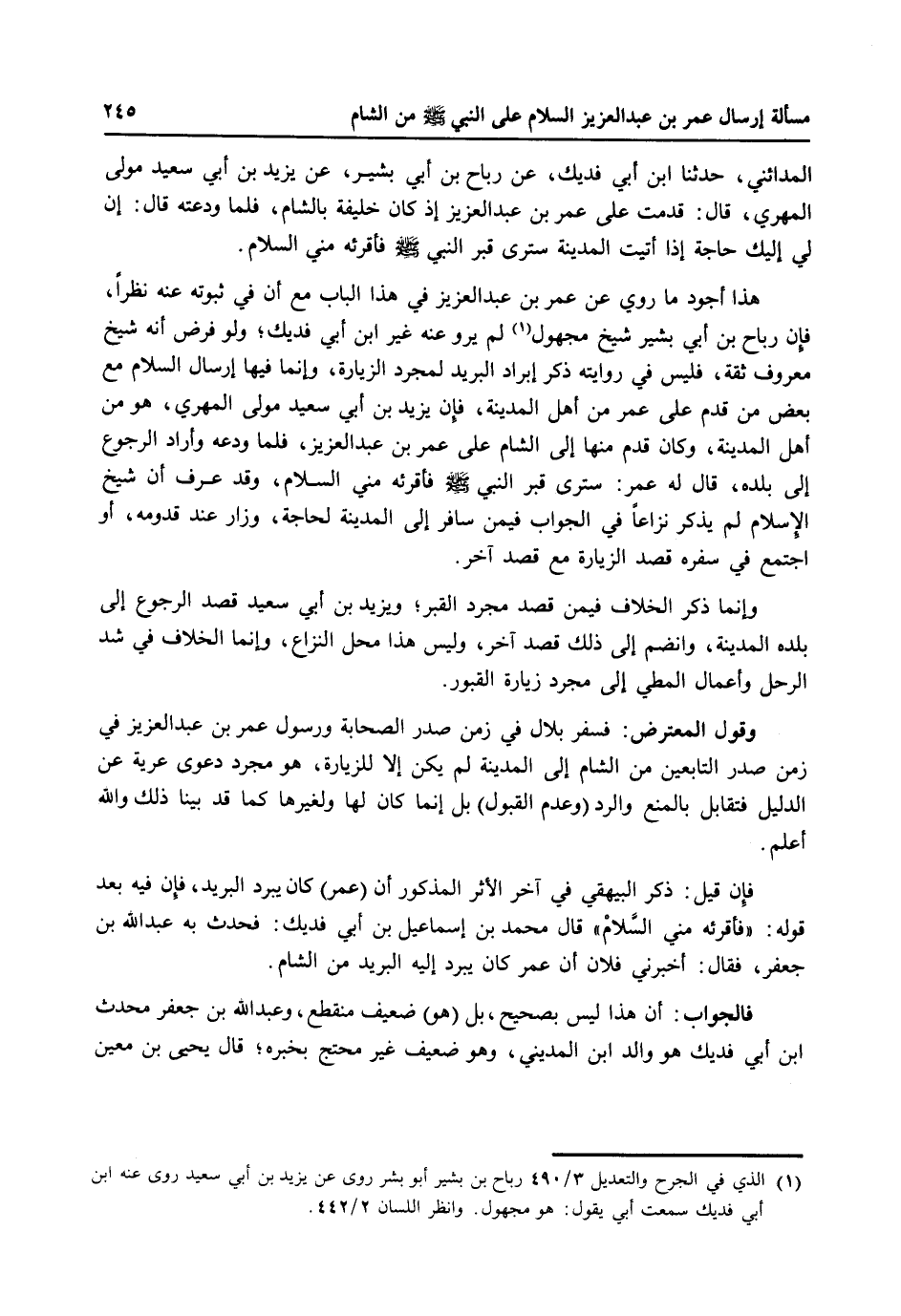 هذا أجود ما روي عن عمر بن عبد العزيز في هذا الباب مع أن في ثبوته عنه نظراً فإن رباح بن أبي بشير شيخ مجهول (1) لم يرو عنه غير ابن أبي فيدك، ولو فرض أنه شيخ معروف ثقة، فليس في روايته ذكر إيراد البريد لمجرد الزيارة، وإنما فيها إرسال السلام مع بعض من قدم على عمر من أهل المدينة، فإن يزيد بن أبي سعيد مولى المهري، هو من أهل المدينة، وكان قدم منها إلى الشام على عمر بن عبد العزيز، فلما ودعه وأرد الرجوع إلى بلده، قال له عمر: سترى قبر النبي صلى الله عليه وسلم فاقرئه مني السلام، وقد عرف أن شيخ الإسلام لم يذكر نزاعاً في الجواب فيمن سافر إلى المدينة لحاجة، وزار عند قدومه، أو اجتمع في سفره قصد الزيارة مع قصد آخر.
