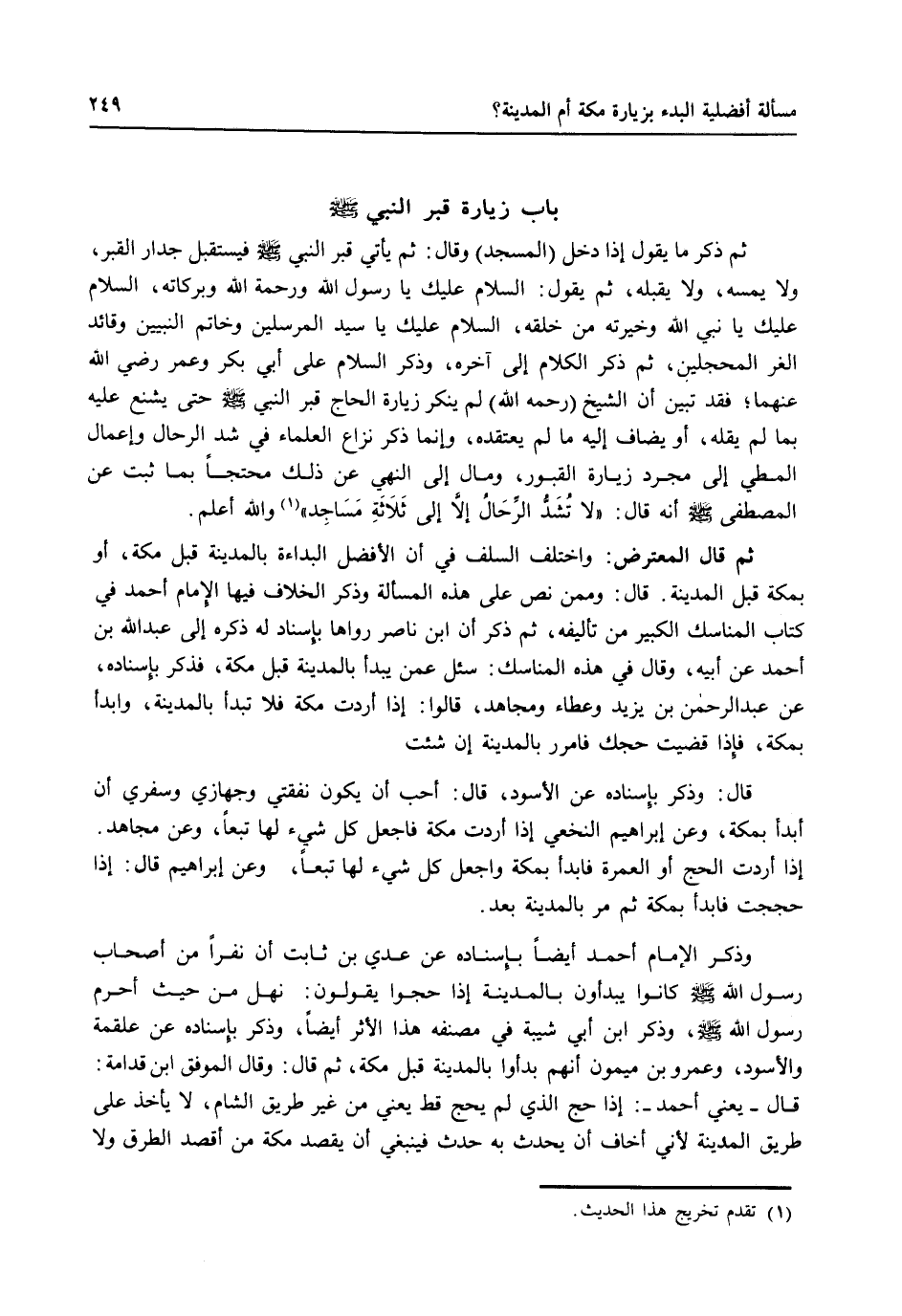 ثم قال المعترض: واختلف السلف في أن الأفضل البداءة بالمدينة قبل مكة، أو بمكة قبل المدينة، قال: وممن نص على هذه المسألة وذكر الخلاف فيها الإمام أحمد في كتاب المناسك الكبير من تأليفه، ثم ذكر أن ابن ناصر رواها بإسناد له ذكره إلى عبد الله بن أحمد عن أبيه، وقال في هذه المناسك، سئل عمن يبدأ بالمدينة قبل مكة، فذكر بإسناده عن عبد الرحمن بن يزيد وعطاء ومجاهد، قالوا: إذا أردت مكة فلا تبدأ بالمدينة وابدأ بمكة، فإذا قضيت حجتك فأمرر بالمدينة إن شئت.