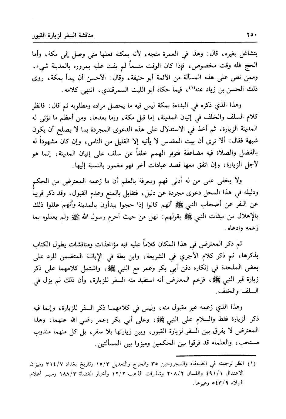 وهذا الذي زعمه غير مقبول منه، وليس في كلامهما ذكر السفر للزيارة، وإنما فيه ذكر الزيارة فقط والسلام على النبي صلى الله عليه وسلم وعلى أبي بكر وعمر رضي الله عنهما، وهذا المعترض لا يفرق بين السفر لزيارة القبور، وبين زيارتها بلا سفر، بل كل منهما مندوب مستحب، والعلماء قد فرقوا بين الحكمين وميزوا بين المسألتين.