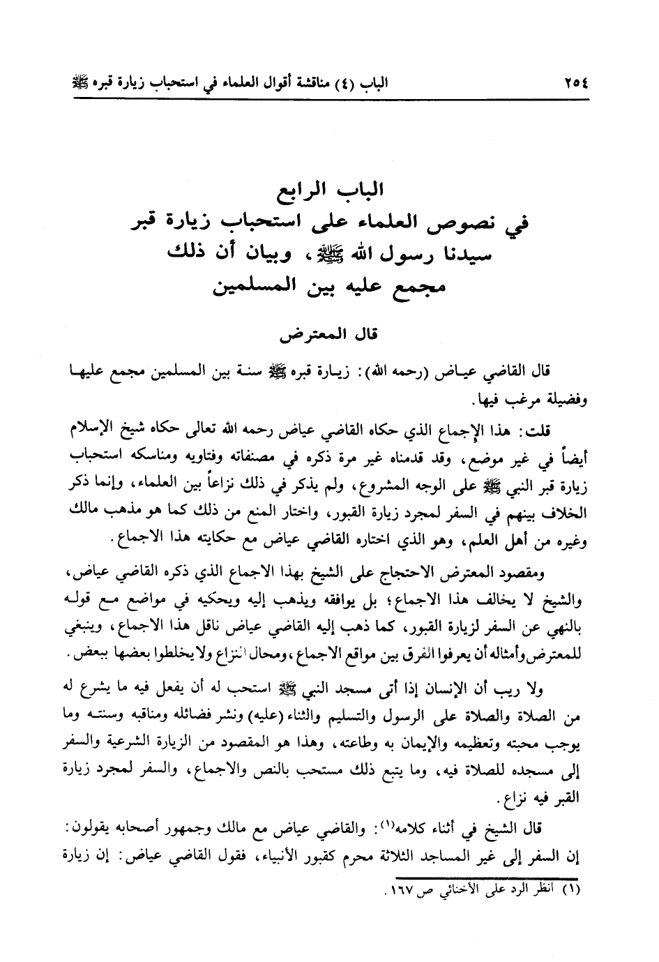 ومقصوده المعترض الاحتجاج على الشيخ بهذا الإجماع الذي ذكره القاضي عياض، والشيخ لا يخالف هذا الإجماع، بل يوافقه ويذهب إليه ويحكيه في مواضع مع قوله بالنهي عن السفر لزيارة القبور، كما ذهب إليه القاضي عياض ناقل هذا الإجماع، وينبغي للمعترض وأمثاله أن يعرفوا الفرق بين مواقع الاجتماع ومحال النزاع ولا يخلطوا بعضها ببعض.