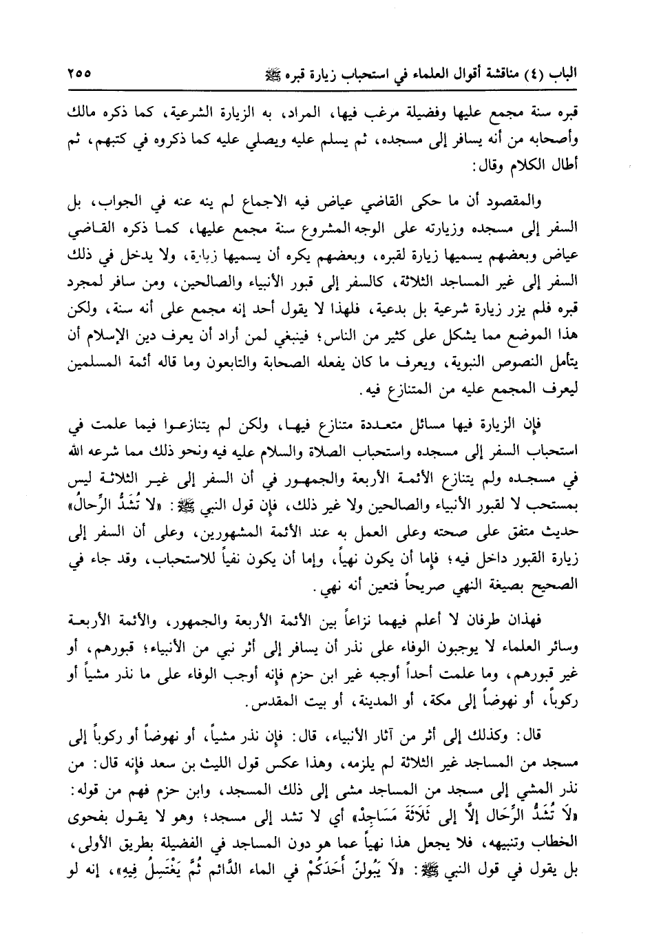 قبره سنة مجمع عليها وفضيلة مرغب فيها، المراد، به الزيارة الشرعية، كما ذكره مالك وأصحابه من أنه يسافر إلى مسجده، ثم يسلم عليه ويصلي عليه كما ذكره في كتبهم، ثم أطال الكلام وقال.
