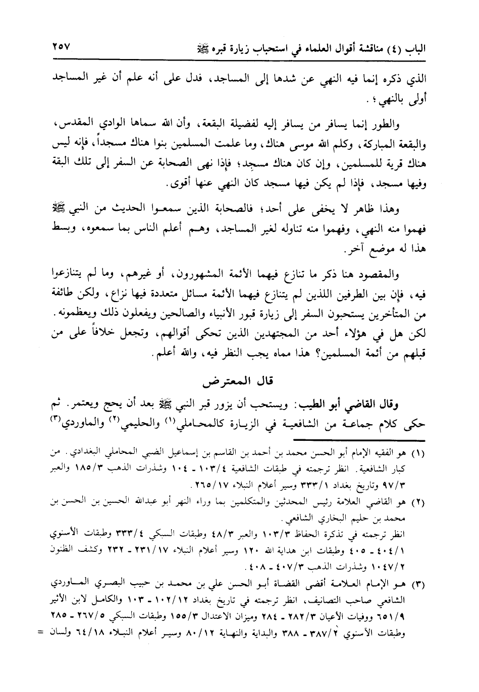 وقال القاضي أبو الطيب: ويستحب أن يزور قبر النبي صلى الله عليه وسلم بعد أن يحج ويعتمر، ثم حكى كلام جماعة من الشافعية في الزيارة كالمحاملي (1) والحليمي (2) والماوردي (3)