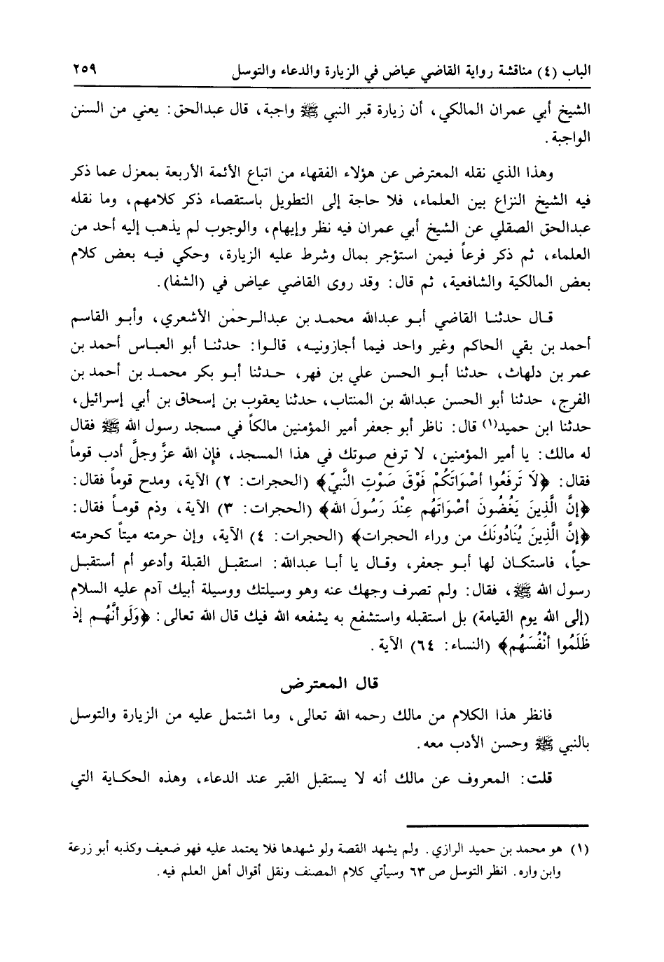 قال حدثنا القاضي أبو عبد الله محمد بن عبد الرحمن الأشعري، وأبو القاسم أحمد بن بقي الحاكم وغير واحد فيما أجازونيه، قالوا: حدثنا أبو العباس أحمد بن عمر بن دلهاث، حدثنا أبو الحسن علي بن فهر، حدثنا أبو بكر محمد بن أحمد بن الفرج، حدثنا أبو الحسن عبد الله بن المنتاب، حدثنا يعقوب بن إسحاق بن أبي إسرائيل، حدثنا ابن حميد (1) قال: ناظر أبو جعفر أمير المؤمنين ملكاً في مسجد رسول الله صلى الله عليه وسلم فقال له مالك: يا أمير المؤمنين، لا ترفع صوتك في هذا المسجد، فإن الله عز وجل أدب قومه فقال: {يَا أَيُّهَا الَّذِينَ آمَنُوا لَا تَرْفَعُوا أَصْوَاتَكُمْ} (الحجرات 002) ومدح قوماً فقال: {إِنَّ الَّذِينَ يَغُضُّونَ أَصْوَاتَهُمْ عِندَ رَسُولِ اللَّهِ} (الحجرات 003) وذم قوماً فقال: {إِنَّ الَّذِينَ يُنَادُونَكَ مِن وَرَاء الْحُجُرَاتِ} (الحجرات 004) وأن حرمته ميتاً كحرمته حياً، فاستكان لها أبو جعفر، وقال يا ابا عبد الله: استقبل القبلة وأدعو أم استدبر رسول الله صلى الله عليه وسلم، فقال ولم تصرف وجهك عنه وهو وسيلتك ووسيلة أبيك آدم عليه السلام (إلى الله يوم القيامة) بل استقبله واستشفع به يشفعه الله فيك قال الله تعالى: {وَلَوْ أَنَّهُمْ إِذ ظَّلَمُواْ أَنفُسَهُمْ} (النساء 064)