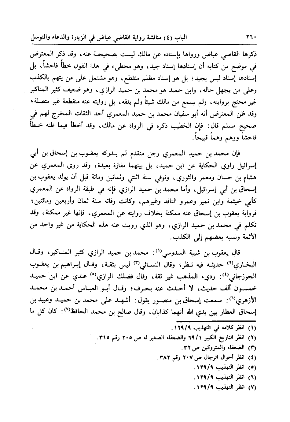 ذكرها القاضي عياض ورواها بإسناد عن مالك ليست بصحيحة عنه، وقد ذكر المعترض في موضع من كتابه أن إسنادها إسناد جيد، وهو مخطئ في هذا القول خطأ فاحشاً، بل إسنادها إسناد ليس بجيد، بل هو إسناد مظلم منقطع، وهو مشتمل على من يتهم بالكذب وعلى من يجهل حاله وابن حميد هو محمد بن حميد الرازي، وهو ضعيف كثير المناكير غير محتج بروايته، ولم يسمع من مالك شيئاً ولم يلقه،بل روايته عنه منطقة غير متصلة وقد ظن المعترض أنه أبو سفيان محمد بن حميد المعمري أحد الثقات المخرج لهم في صحيح مسلم قال:فإن الخطيب ذكره في الرواة عن مالك وقد أخطأ فيما ظنه خطأ فاحشاً ووهم وهماً قبيحاً.