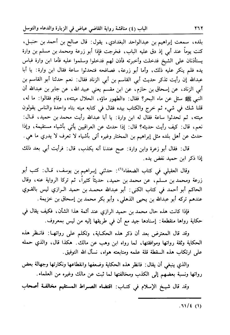 بلده، سمعت إبراهيم بن عبد الواحد البغدادي، يقول: قال صالح بن أحمد بن حنبل كنت يوماً عند أبي إذ دق عليه الباب، فخرجت فإذا أبو زرعة ومحمد بن مسلم بن واره يستأذنان على الشيخ فدخلت وأخبرته فأذن لهم فدخلوا وسلموا عليه فأما ابن واره فباس يده فلم ينكر عليه ذلك، وأما أبو زرعة، فصافحة فتحدثوا ساعة فقال ابن واره: يا أبا عبد الله إن رأيت تذكر حديث أبي القاسم بن أبي الزناد فقال: نعم حدثنا أبو القاسم ابن أبو الزناد عن إسحاق بن حازم، عن ابن مقسم يعني عبيد الله، عن جابر بن عبد الله أن النبي صلى الله عليه وسلم سئل عن ماء البحر؟ فقال: ((الطهور ماؤه، الحلال ميتته)) وقام فقالوا: ما له قلنا شك في شيء ثم خرج والكتاب بيده فقال في كتابه ميته بتاء واحدة والناس يقولون ميتته، ثم تحدثوا ساة فقال له ابن واره: يا أبا عبد الله رأيت محمد بن حميد، قال نعم، قال: كيف رأيت حديثه؟ قال: إذا حدث عن العراقيين يأتي بأشياء مستقيمة، وإذا حدث عن أهل بلده مثل إبراهيم بن المختار وغيره أتى بأشياء لا تعرف لا يدري ما هي.