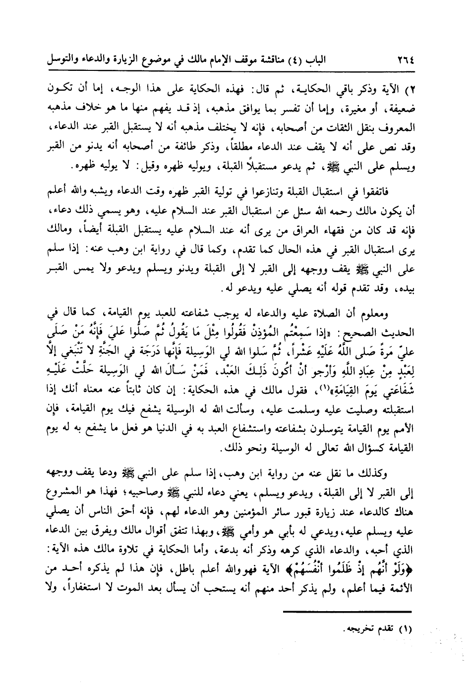 وكذلك ما نقل عنه من رواية ابن وهب، إذا سلم على النبي صلى الله عليه وسلم ودعا يقف ووجه إلى القبر لا إلى القبلة،ويدعوا ويسلم، يعني دعاء للنبي صلى الله عليه وسلم وصاحبه، فهذا هو المشروع هناك كالدعاء عند زيارة قبور سائر المؤمنين وهو الدعاء لهم، فإنه أحق الناس أن يصلي عليه ويسلم عليه، ويدعي له بأبي هو وأمي صلى الله عليه وسلم وبهذا تتفق أقوال مالك ويفرق بني الدعاء الذي أحبه، والدعاء الذي كرهه وذكر أنه بدعة، وأما الحكاية في تلاوة مالك هذه الآية: ((ولو أنهم إذ ظلموا أنفسهم)) الآية فهو والله أعلم باطل، فإن هذا لم يذكره أحد من الأئمة فيما أعلم، ولم يذكر أحد منهم أنه يستحب أن يسأل بعد الموت لا استغفاراً ولا