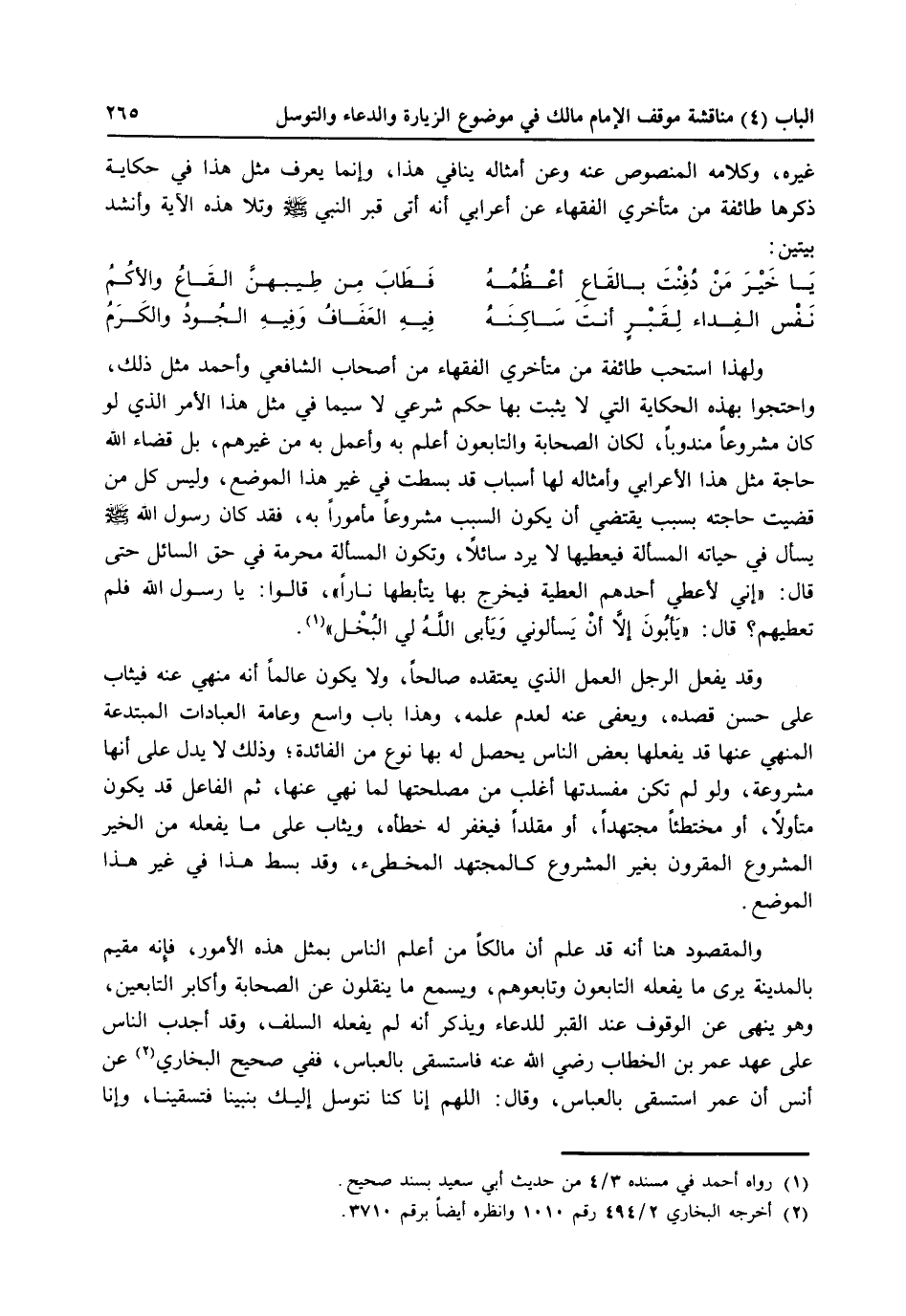 والمقصود هنا أنه قد علم أن مالكاً من أعلم الناس بمثل هذه الأمور، فإنه مقيم بالمدينة يرى ما يفعله التابعون وتابعوهم ويسمع ما ينقلون عن الصحابة وأكابر التابعين، على عهد عمر بن الخطاب رضي الله عنه فاستسقى بالعباس، ففي صحيح البخاري (2) عن أنس أن عمر استسقى بالعباس، وقال: اللهم إنا كنا نتوسل إليك بنبيك فتسقينا، وإنا