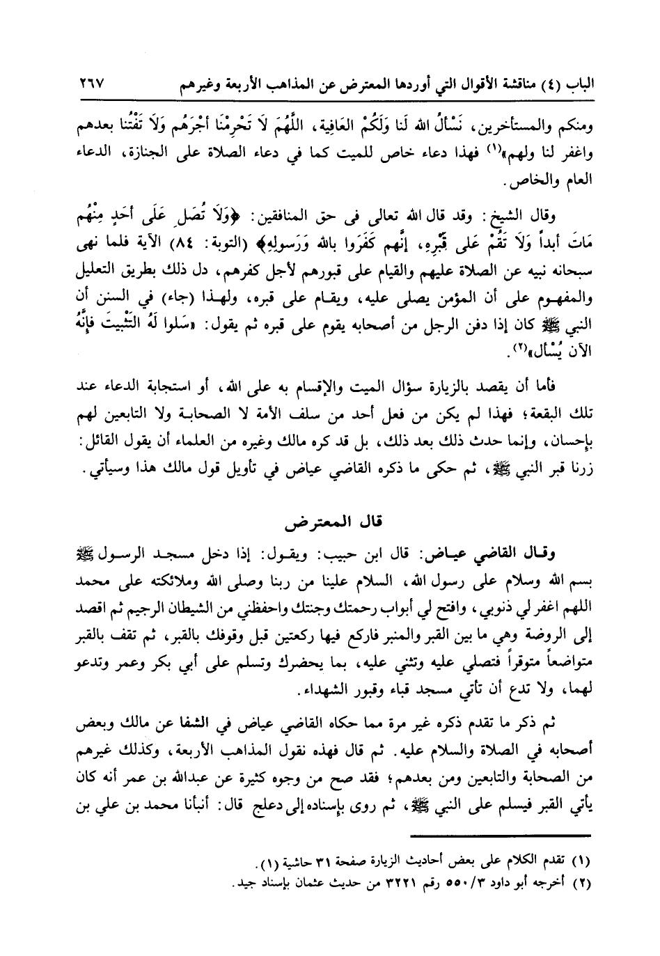 فأما أن يقصد بالزيارة سؤال الميت والإقسام به على الله أو استجابة الدعاء عند تلك البقعة، فهذا لم يكن من فعل أحد من سلف الأمة لا الصحابة ولا التابعين لهم بإحسان وإنما حدث ذلك بعد ذلك، بل قد كره مالك وغيره من العلماء أن يقول القاتل زرنا قبر النبي صلى الله عليه وسلم يم حكى ما ذكره القاضي عياض في تأويل قول مالك هذا وسيأتي.