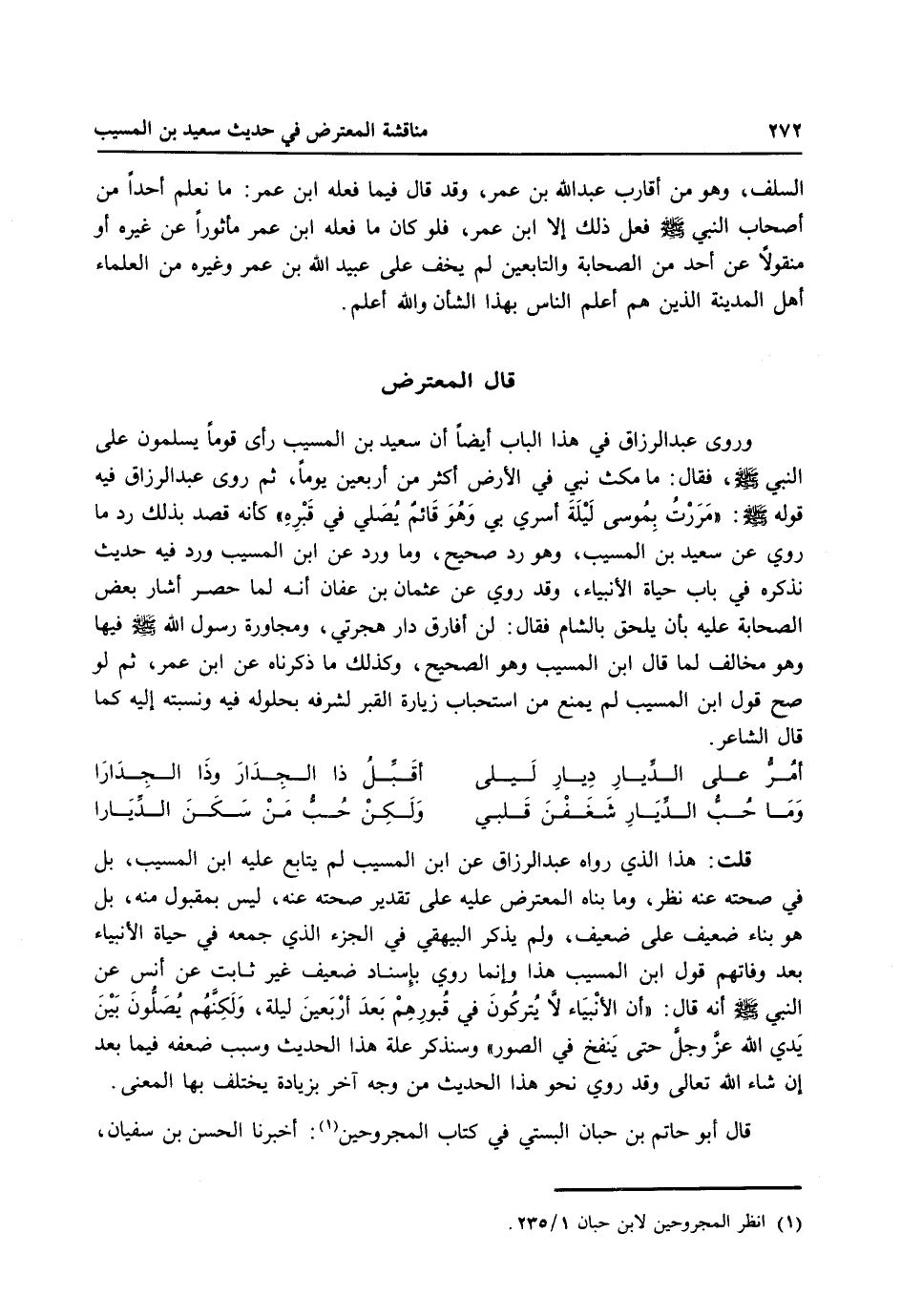 قلت: هذا الذي رواه عبد الرزاق عن ابن المسيب لم يتابع عليه ابن المسيب، بل في صحته عنه نظر، وما بناه المعترض عليه على تقدير صحته عنه، ليس بمقبول منه، بل هو بناء ضعيف على ضعيف، ولم يذكر البيهقي في الجزء الذي جمعه في حياة الأنبياء بعد وفاتهم قول ابن المسيب هذا وإنما روى بإسناد ضعيف غير ثابت عن أنس عن النبي صلى الله عليه وسلم أنه قال: ((إن الأنبياء لا يتركون في قبورهم بعد أربعين ليلة، ولكنهم يصلون بين يدي الله عز وجل حتى ينفخ في الصور، وسنذكر علة هذا الحديث وسبب ضعفه فيما بعد إن شاء الله تعالى وقد روى نحو هذا الحديث من وجه آخر بزيادة يختلف بها المعنى.