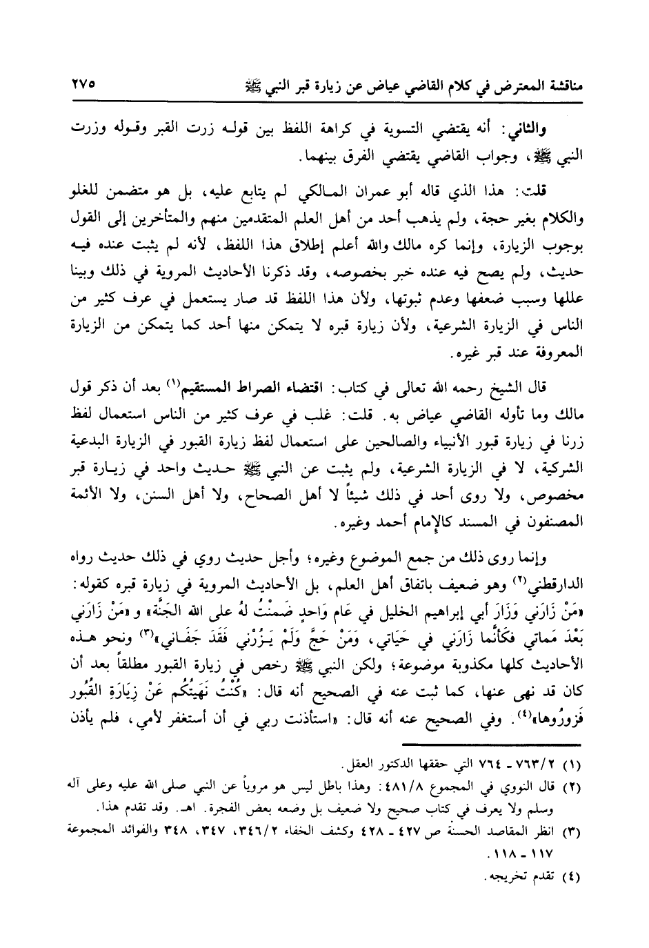 قلت: هذا الذي قال أبو عمران المالكي لم يتابع عليه، بل هو متضمن للغلو والكلام بغير حجة، ولم يذهب أحد من أهل العلم المتقدمين منهم والمتأخرين إلى القول بوجوب الزيارة، وإنما كره مالك والله أعلم إطلاق هذا اللفظ لأنه لم يثبت عنده فيه حديث، ولم يصح فيه عنده خبر بخصوص، وقد ذكرنا الأحاديث المروية في ذلك وبينا عللها وسبب ضعفها وعدم ثبوتها، ولأن هذا اللفظ قد صار يستعمل في عرف كثير من الناس في الزيارة الشرعية، ولأن زيارة قبره لا يتمكن منها أحد كما يتمكن من الزيارة المعروفة عند قبر غيره.