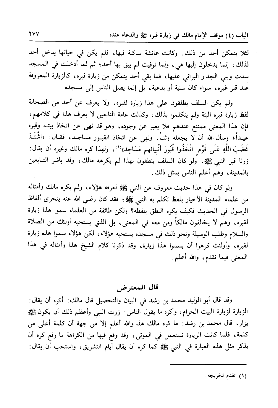 وقد قال أبو الوليد محمد بن رشد في البيان والتحصيل قال مالك: أكره أن يقال الزيارة لزيارة البيت الحرام، وأكره ما يقول الناس: زرت التي وأعظم ذلك أن يكون صلى الله عليه وسلم يزار، قال محمد بن رشد، ما كره مالك هذا والله أعلم إلا من جهة أن كلمة أعلى من كلمة، فلما كانت الزيارة تستعمل في الموتى، وقد وقع فيها من الكراهة ما وقع كره أن يذكر مثل هذه العبارة في النبي صلى الله عليه وسلم كما كره أن يقال أيام التشريق، واستحب أن يقال